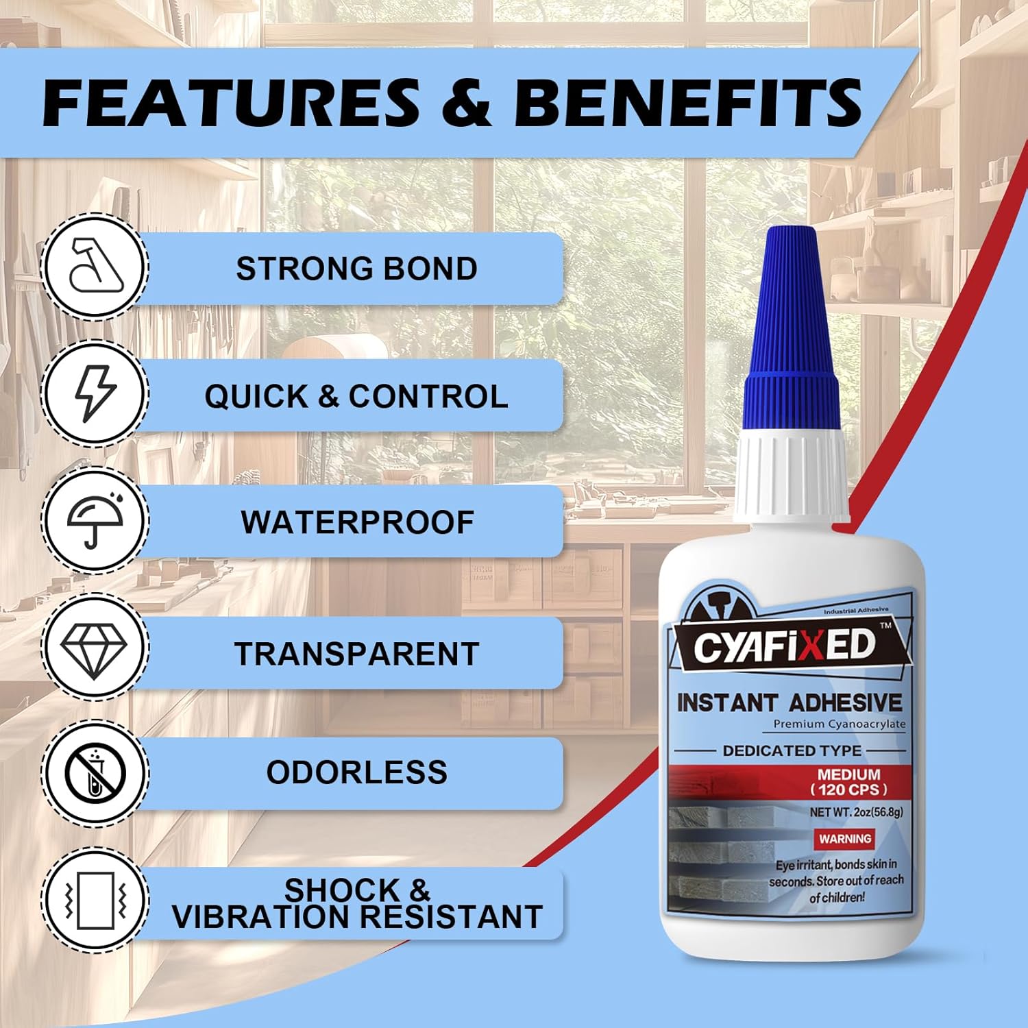 - THE ESSENTIAL GLUE FOR WOODWORKERS: CYAFIXED Medium Viscosity Super CA Glue, cures in 5-60 seconds (depending on wood type), has a viscosity of 120 CPS, is highly adaptable and has amazing adhesion to most woods. Commonly used for wood panel splicing, wood product bonding and repair.