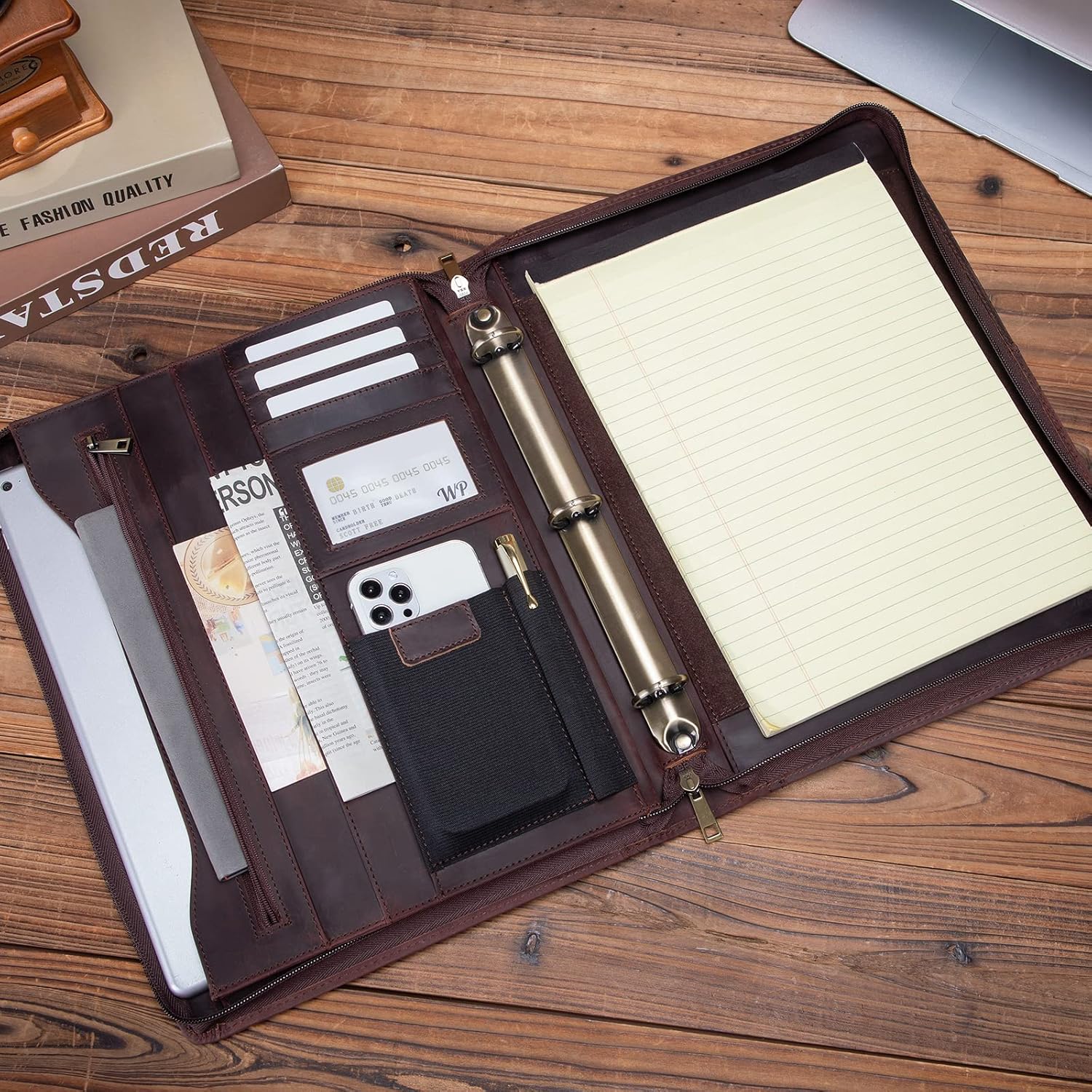 Genuine Leather Portfolio with 3 Ring Binder, Full Grain Leather Padfolio Zippered, A4 Notebook Holder Laptop Sleeve Professional Folder Organizer Gift for Men and Women, Dark Brown