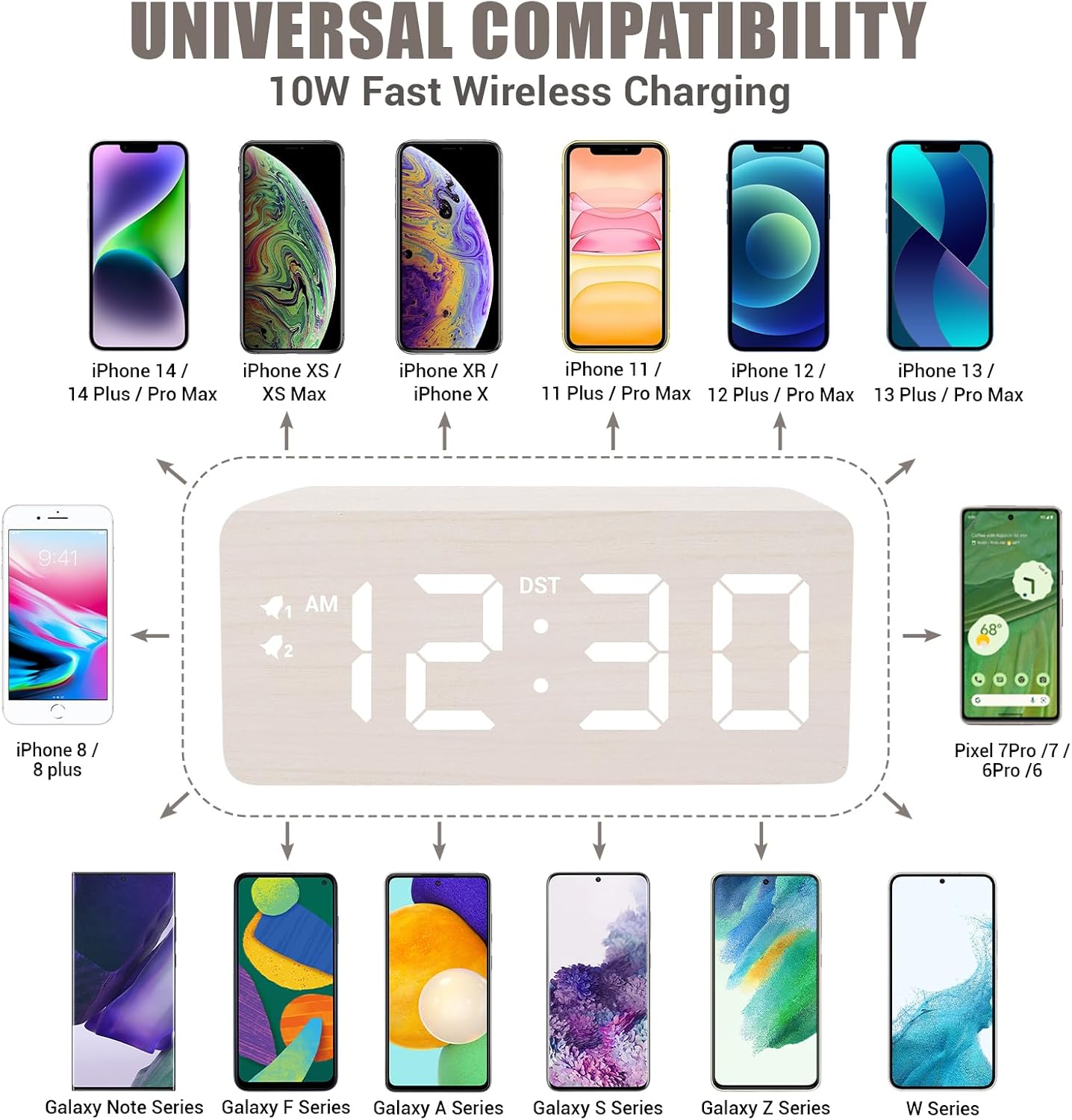 - â°ă10 Faster Faster Wireless Chargingă- Compared with alarm clocks on the market with only 5W wireless charging, this wooden alarm clock is upgraded to 10W weireless charging for faster charging, saving time on charging your phone.It also features a USB port to charge other electronic device.
