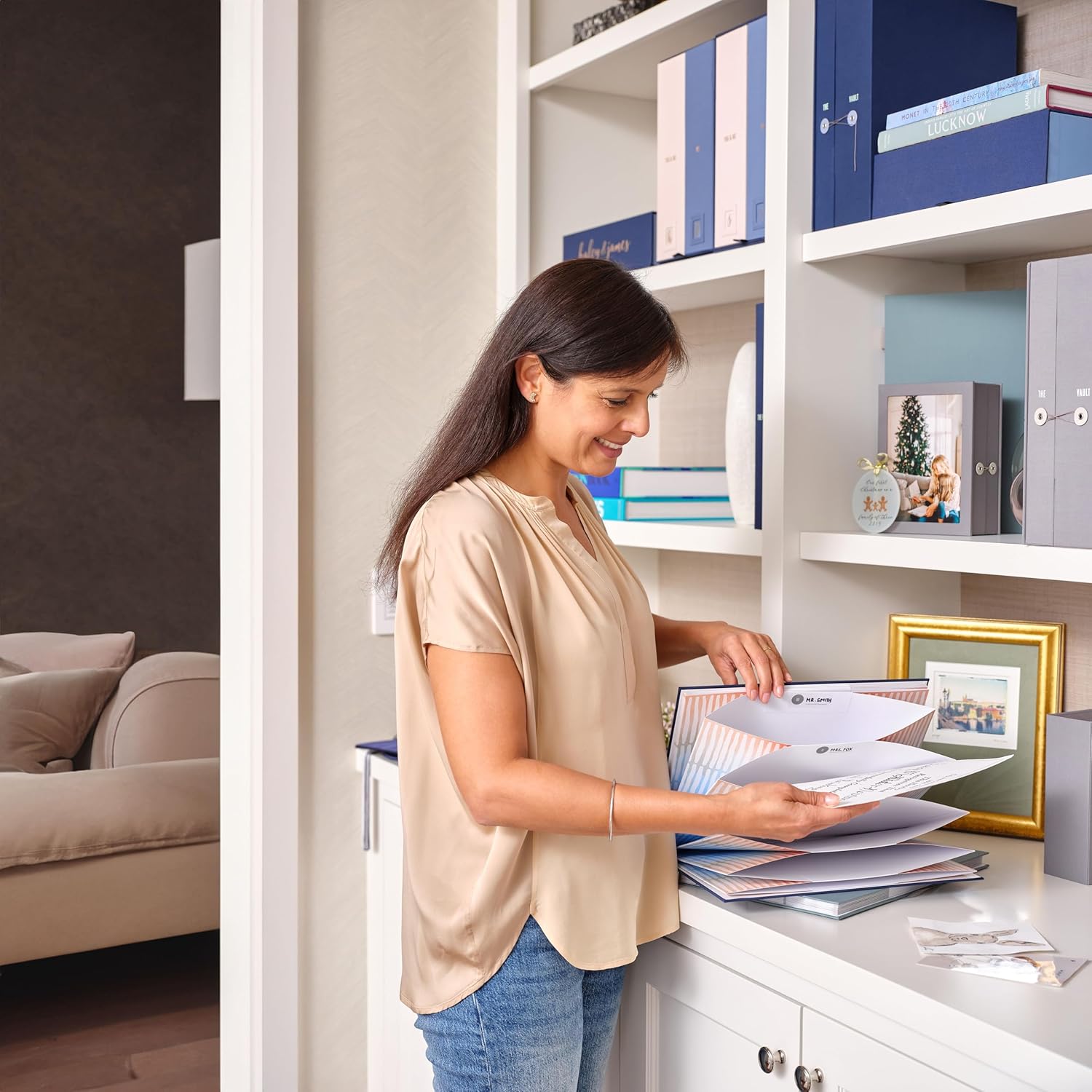 - Luxe accordion file for important documents: Custom-dyed linen book cloth covers are as sturdy as they are beautiful. Grey and blue match existing Savor collections, with a new standout color, Moss.