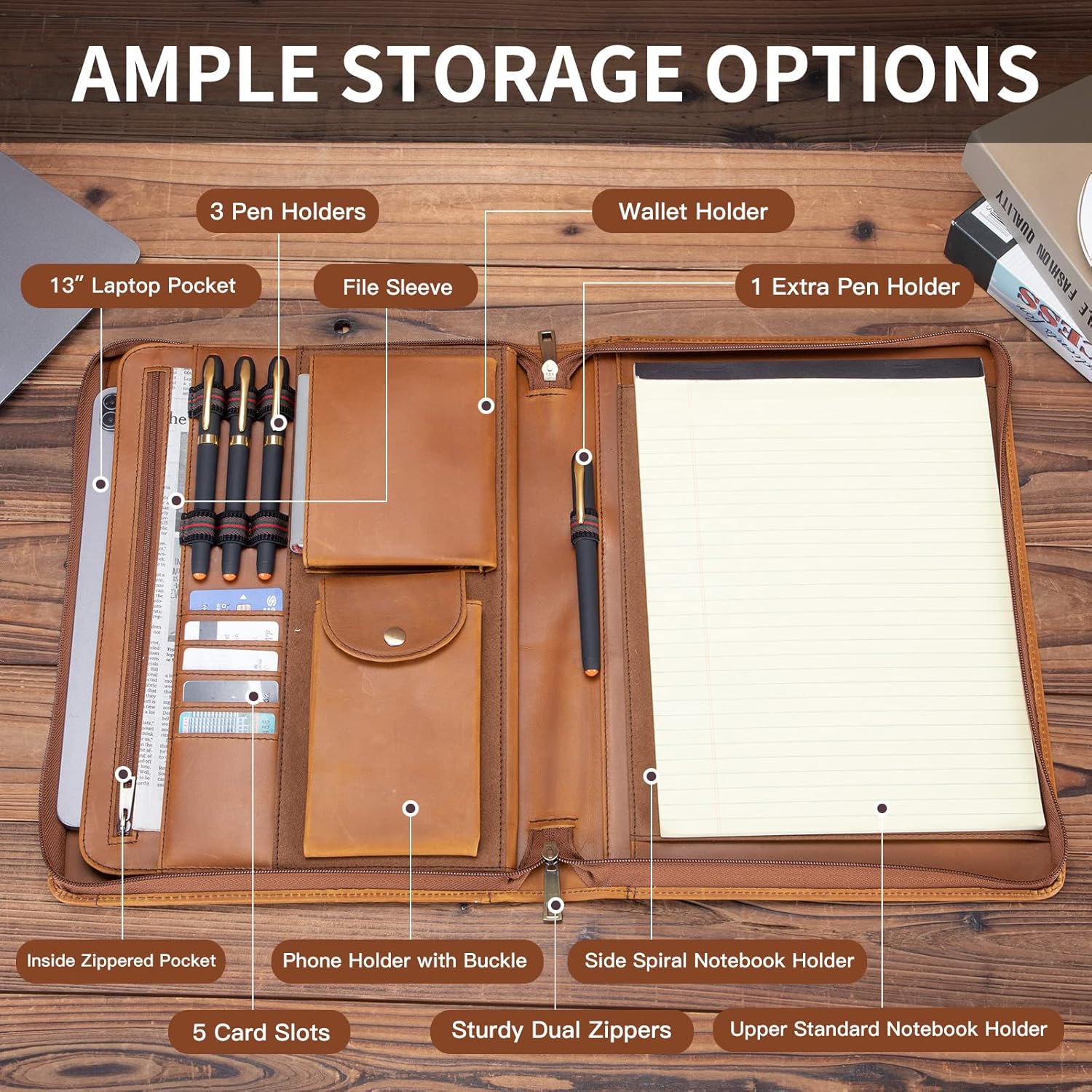 - Functional Storage: Handy exterior pocket for fast filing. Side spiral notebook holder and upper standard notebook holder. Phone holder with buckle, wallet pocket, 4 pen holders, 5 card slots and inside zippered pocket. The inside 13” laptop pocket is large enough for a 13” laptop or 13.3” MacBook Pro (Not for 13.3” MacBook Air).