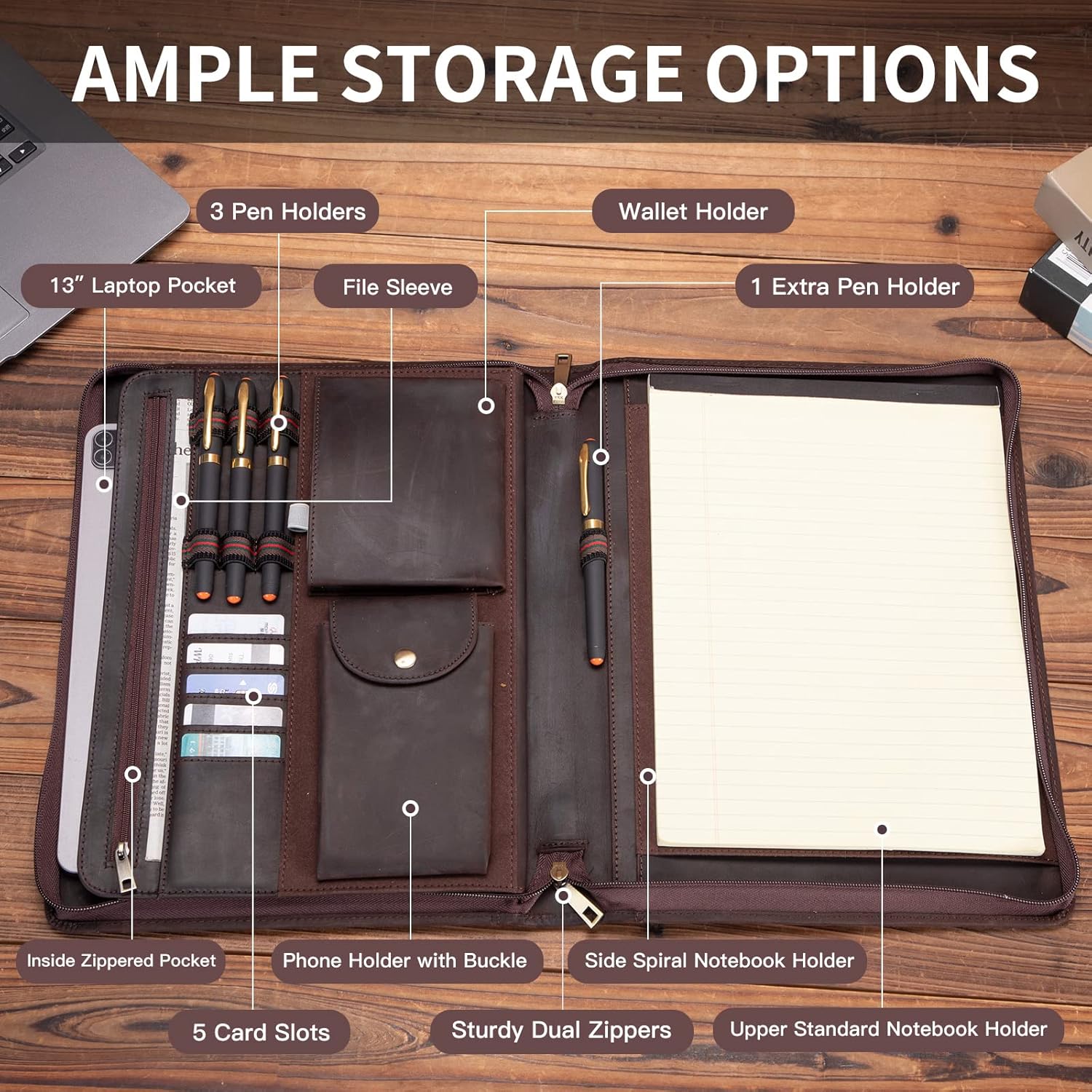 - Large Capacity for More Papers: The leather portfolio is thick with enough room and multiple pockets so you can carry more files and paper inside. Friendly to store paper and easy to close without bulges. The dual YKK zippers enclosure makes it smooth to zip. No more worry about damaging paper or stuck zipper.