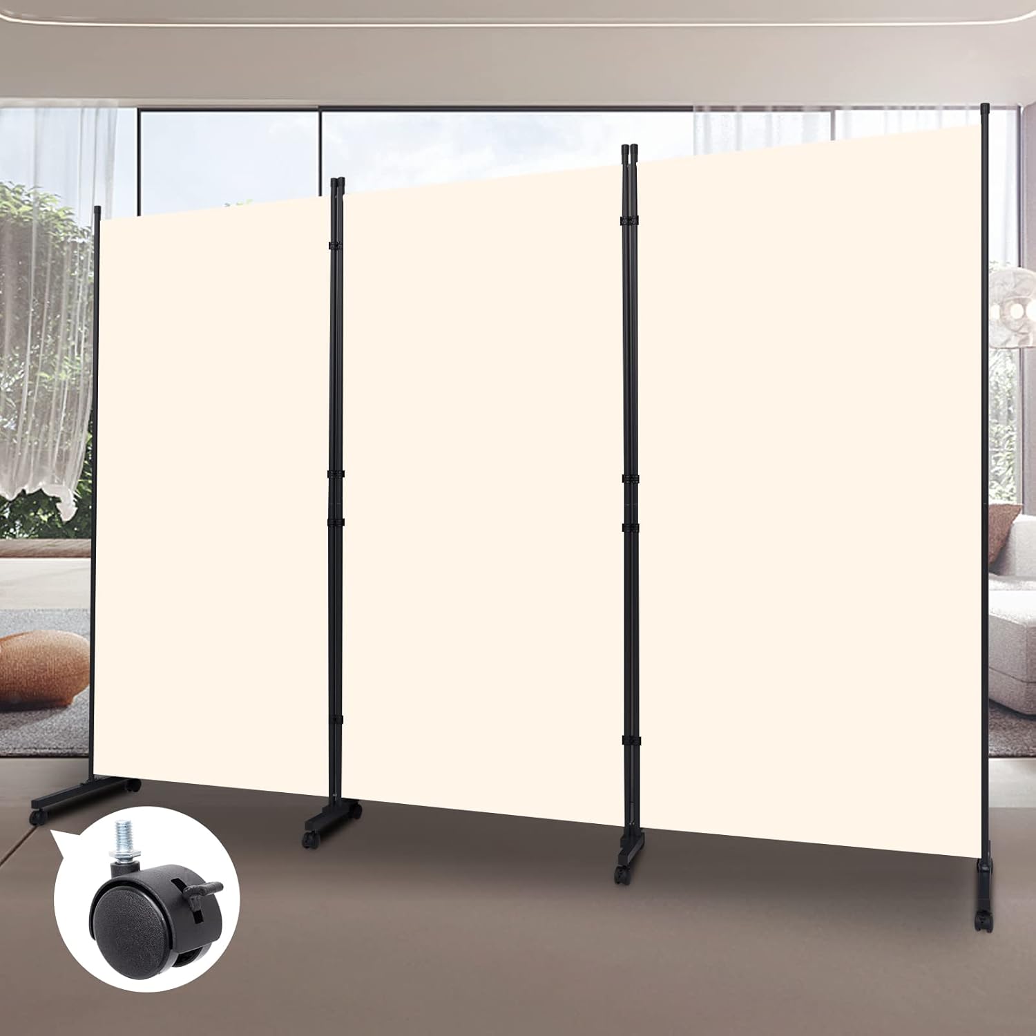 - Movable Quiet & Smooth: Our Room Dividers equipped with 15.75 inch/40 cm steel casters and 8pcs PE universal wheels, which allow you to move it anywhere easier. We also added 4 brakes for each leg, and you are free to let it pause to prevent it from sliding to improve the stability of the privacy screen. The 3 Panel Wall Divider Size: 102''W X 72.2''H, Each Panel Size: 34''Wx72.2''H