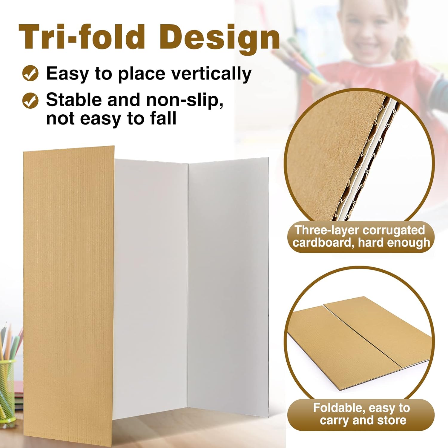 - Hard Material: Our poster board trifold is made of high-quality three-layer corrugated cardboard, hard enough, will not be easily broken and bent, strong and durable, placed on the desktop stable and non-slip, you can use without worry.