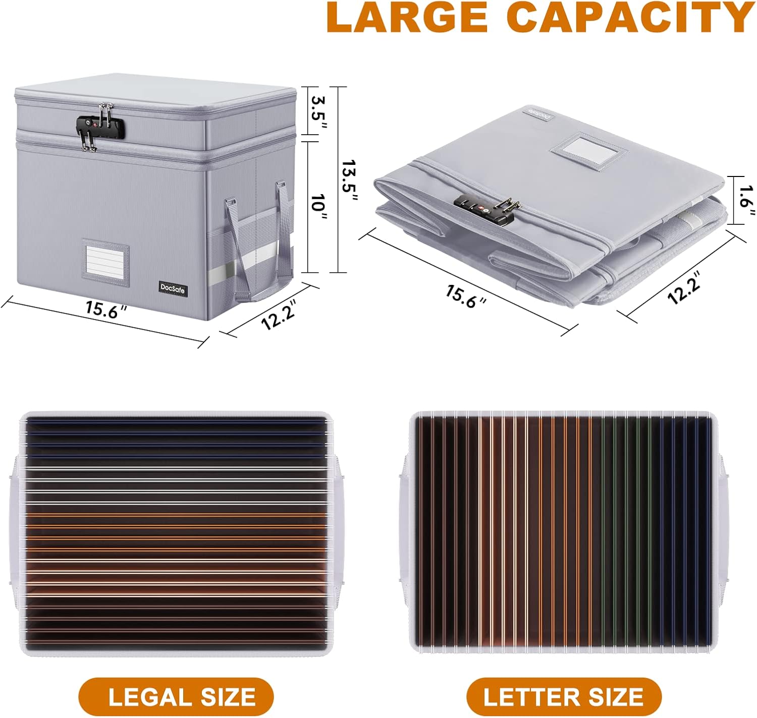 DocSafe File Box with Lock,Multi-Layer Fireproof Document Box Collapsible File Storage Organizer with Pocket,Large Portable Home Office Filing Cabinet Safe for Hanging Letter/Legal Size Folder,Silver