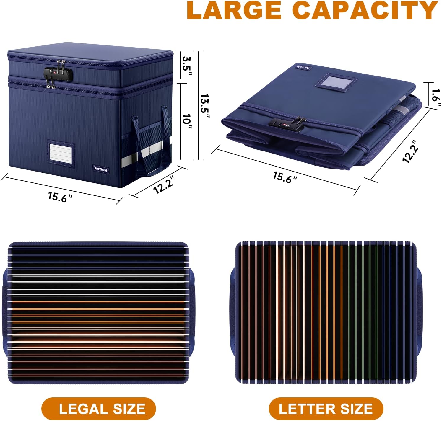 DocSafe File Box with Lock,Multi-Layer Fireproof Document Box Collapsible File Storage Organizer with Pockets/Handle,Large Portable Home Office Filing Safe for Hanging Letter/Legal Size Folders,Blue