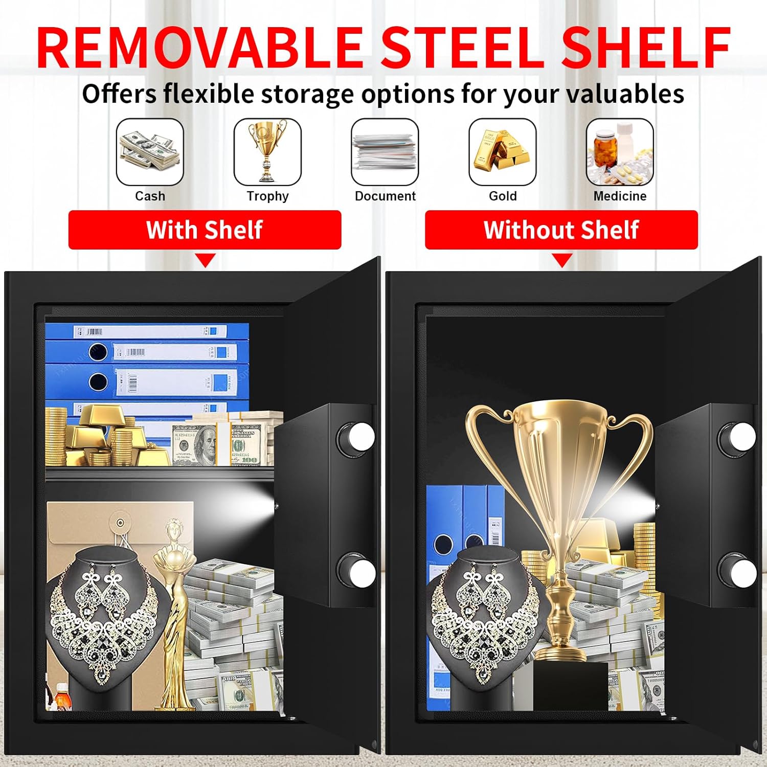 - CAPACITY: 3.2 cubic feet interior space with removable shelf for flexible organization of documents, valuables, and firearms