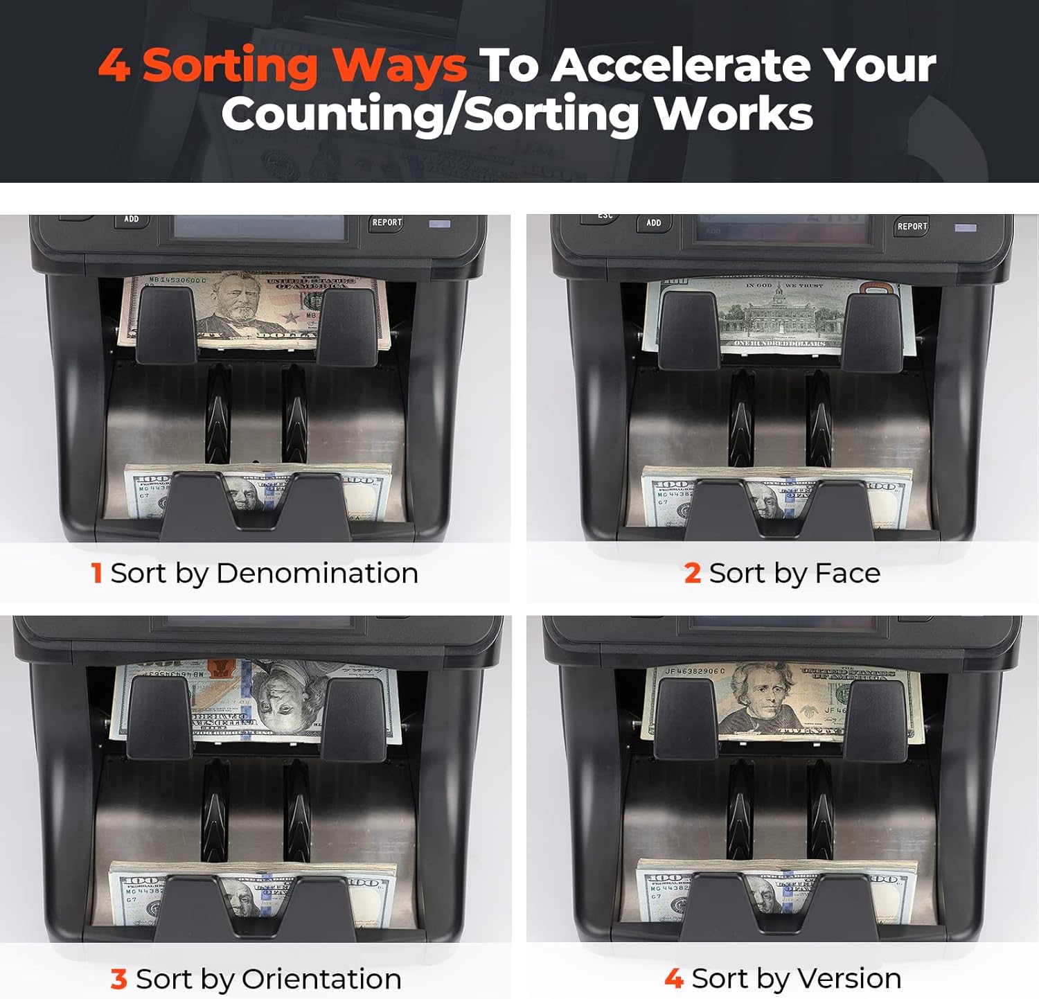 - ✅[Not Just Count, also Sort] MUNBYN 2024 Newest Mixed Denomination Money Counter Machine. Counts mixed denomination bills, reports the total value/breakdown, and sorts bills by the reject pocket. It can also sort the bills by Denomination/Face/Orientation/Currency/Version. Easily sort out a large amount of mixed bills into bundles of $1, $2, $5, $20, $50, $100. Ideal for big cash flow business weekly bank deposit