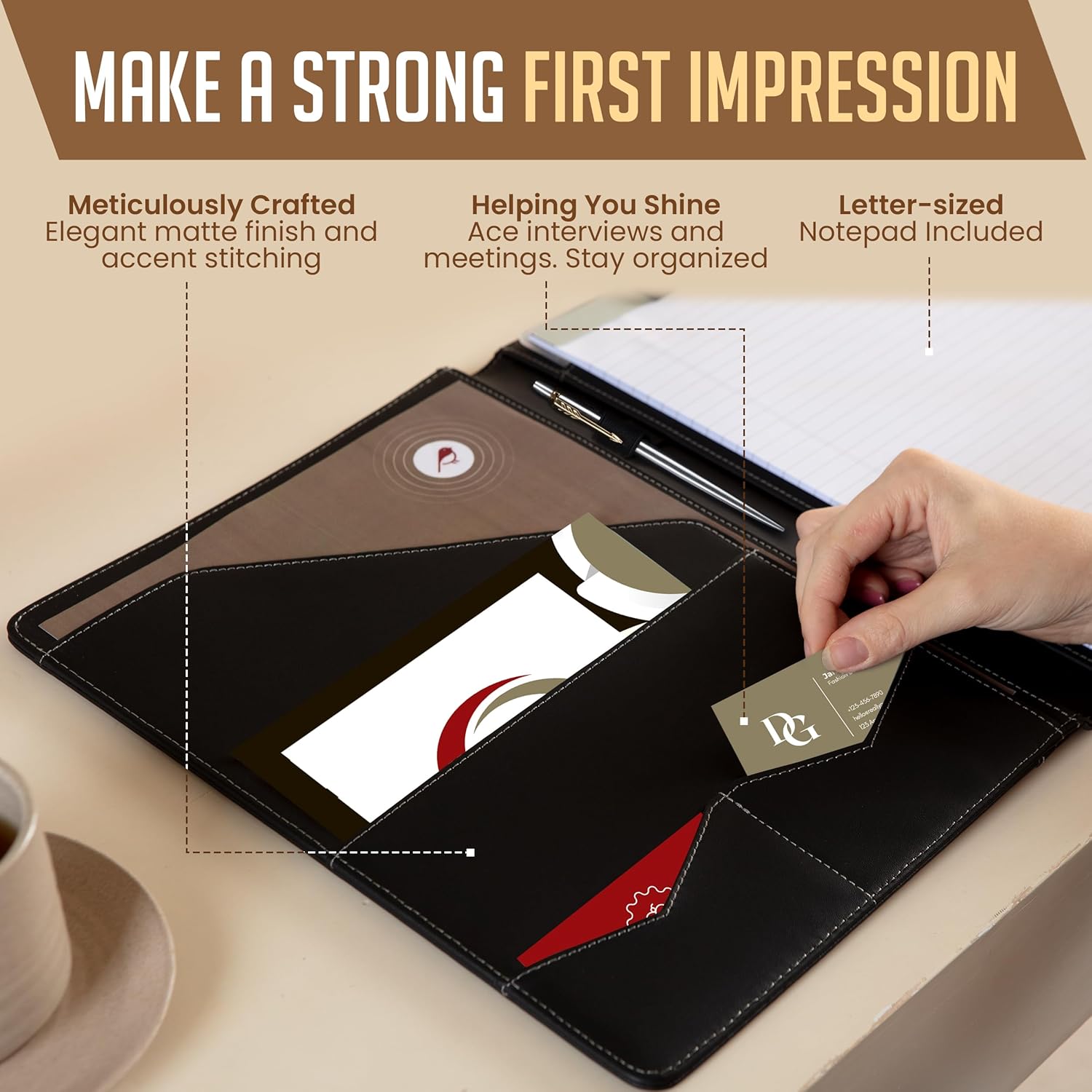 - ✅ PREMIUM FUNCTIONALITY & DURABILITY: Convenient, safe pockets ideal for documents, business cards, travel tickets, pitch proposals & resumes. Includes a pen holder & refillable writing notepad that you can use out of the box.