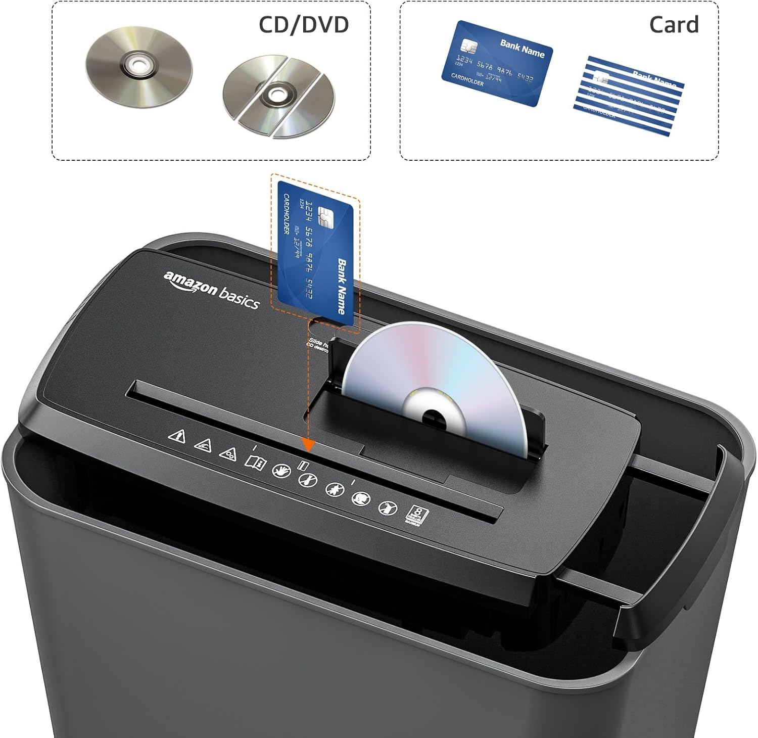 Amazon Basics 8-Sheet Strip Cut Paper, CD, and Credit Card Shredder with Auto-Off Compact, Portable Design, No Basket, Extendable Arm, Black
