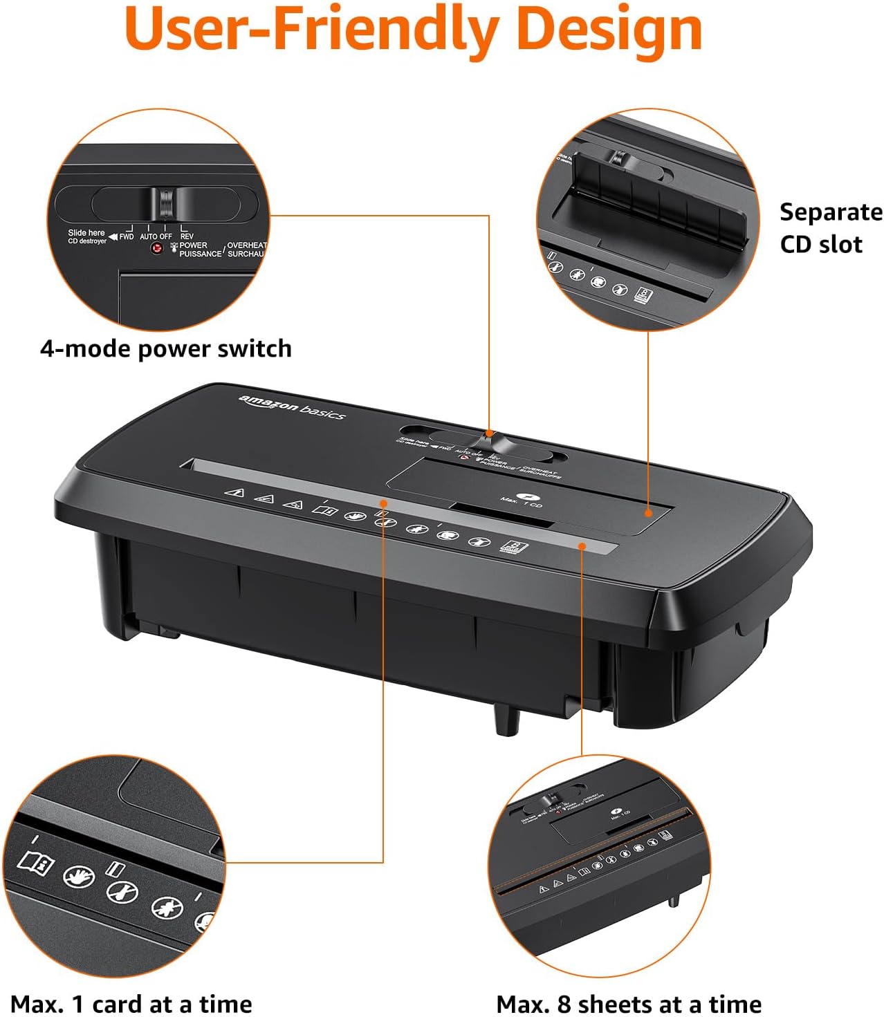 - Accepts up to 8 sheets of 20-pound bond paper at a time (no need to remove staples or small paper clips)