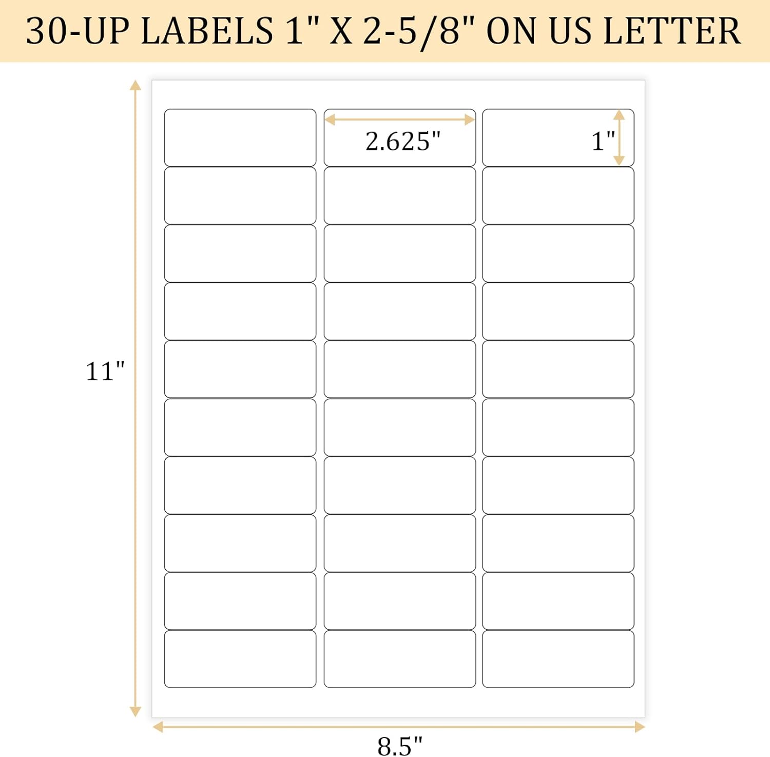 - 【Specification】Label size: 1" x 2-5/8", Sheet size: 8-1/2" X 11" (US Letter Size). 30 Labels per sheet, total 30 Sheets = 900 Labels