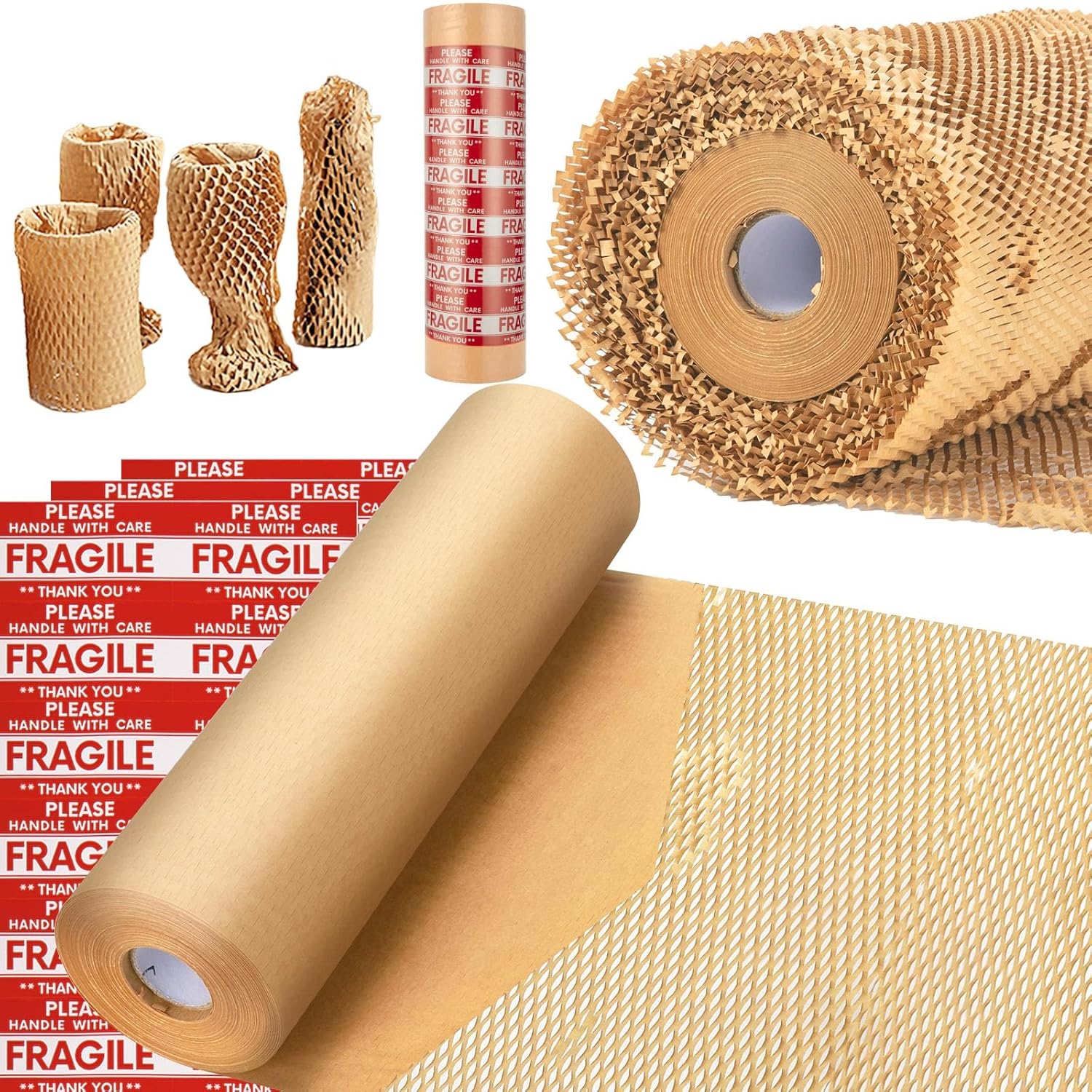 Honeycomb Packing Paper, MINHAO 15"x300' Eco Friendly Packing Paper for Moving Recyclable Honeycomb Paper Moving Supplies Bubble Paper Wrapping Protective Roll, With 36 Fragile Sticker Labels