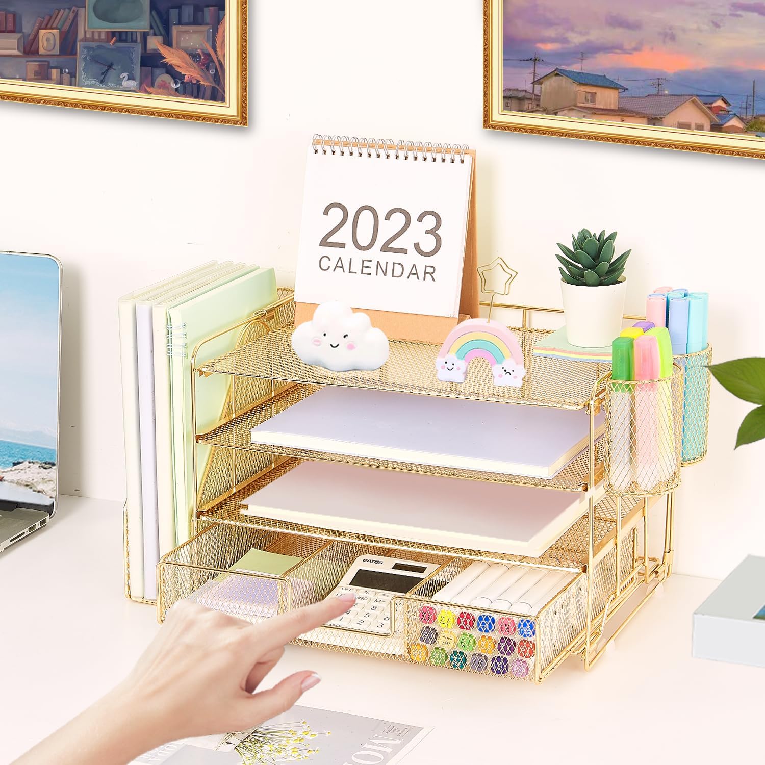 - đăMulti-Functional Office OrganizationăGet your work area in order with the OPNICE Desk Organizer! Featuring 4 spacious trays, a vertical file organizer, 2 convenient hanging pen holders, and a sliding drawer, you can store all your office supplies, classify and organize them, and keep your desktop tidy