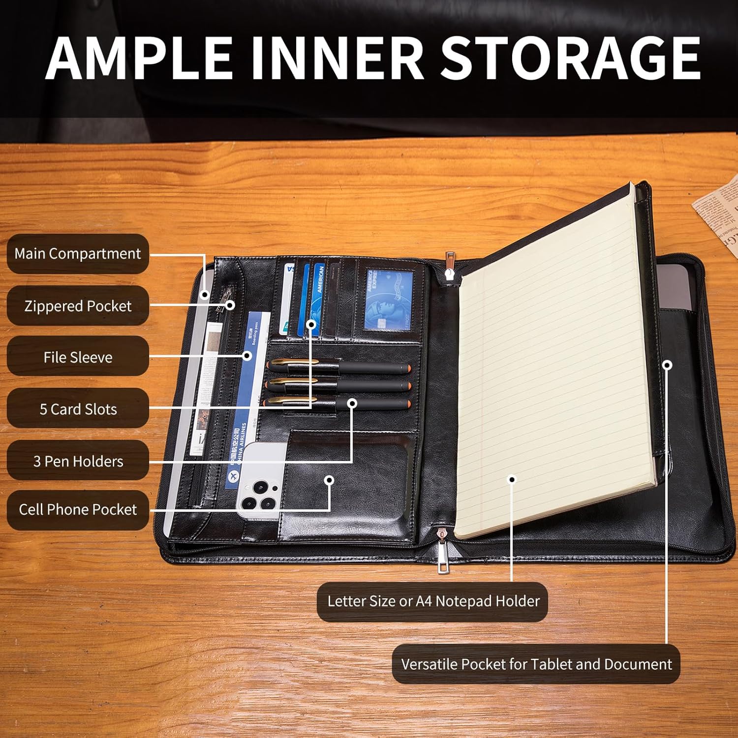 - Spacious Inner Pocket: The main compartment allows you to keep larger items neatly in one place. The YKK zippered pocket ensures the security of valuable or confidential items, while the file sleeve keeps files or folders organized and easily accessible. The 5 card slots, 3 pen holders and a cell phone pocket help keep your items in an orderly manner.