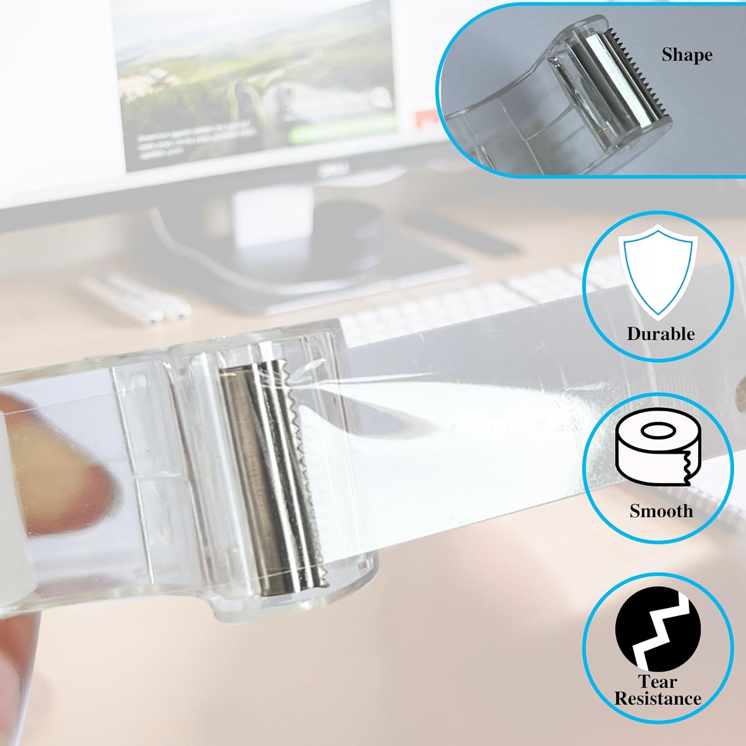 - EASY CUTTING: The clear adhesive tape with dispenser features stainless steel blades with sharp serrated edges to easily tear off rolls of tape, ensuring a smooth and hassle-free application experience