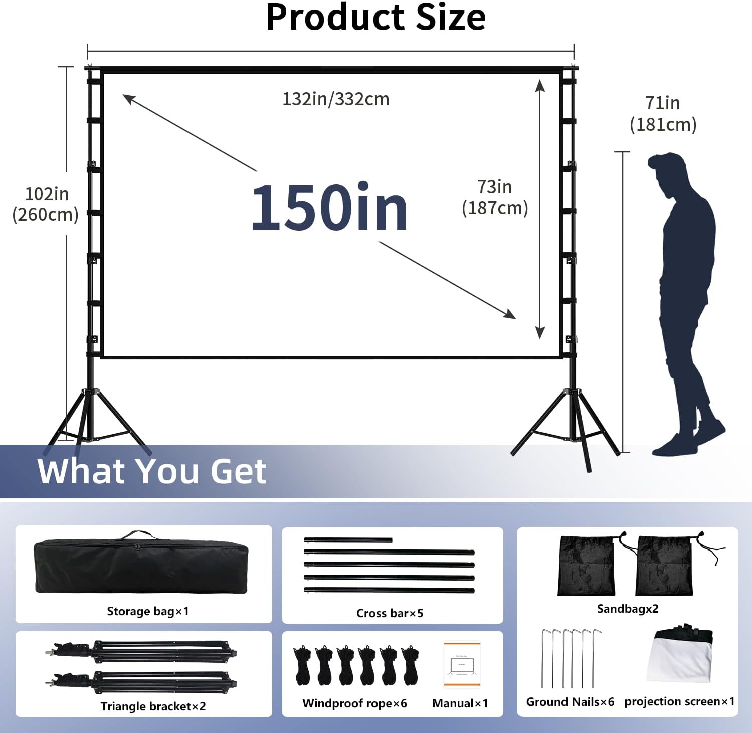 - 【What You Get】 150 inch HD Projection screen×1, Cross bar×5, Triangle bracket×2, Ground nail×6, Windproof rope×6, Carrying bag×1, Manual×1. If you do not receive a right size item or missing any accessories, we will help you solve your problem.【Please kindly note】:When using indoors, please make sure the room width is greater than 140 inches, or you can choose our smaller size screen.