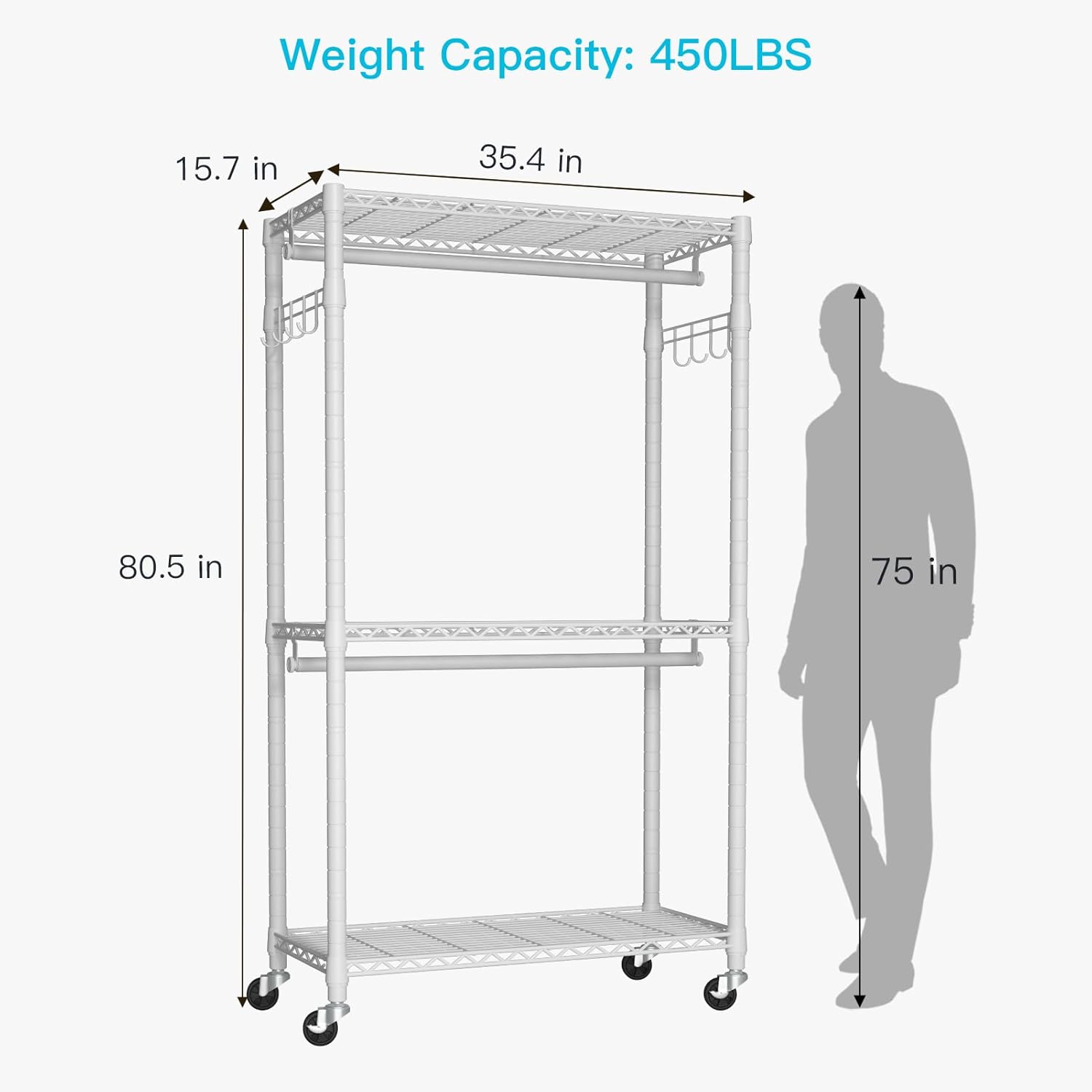 - DIMENSION & WEIGHT CAPACITY: 80.5"H x 35.4"W x 15.7"D (Included wheels height). Weight Capacity: 450LBS. The suitable height can make the clothing rack move freely when needed