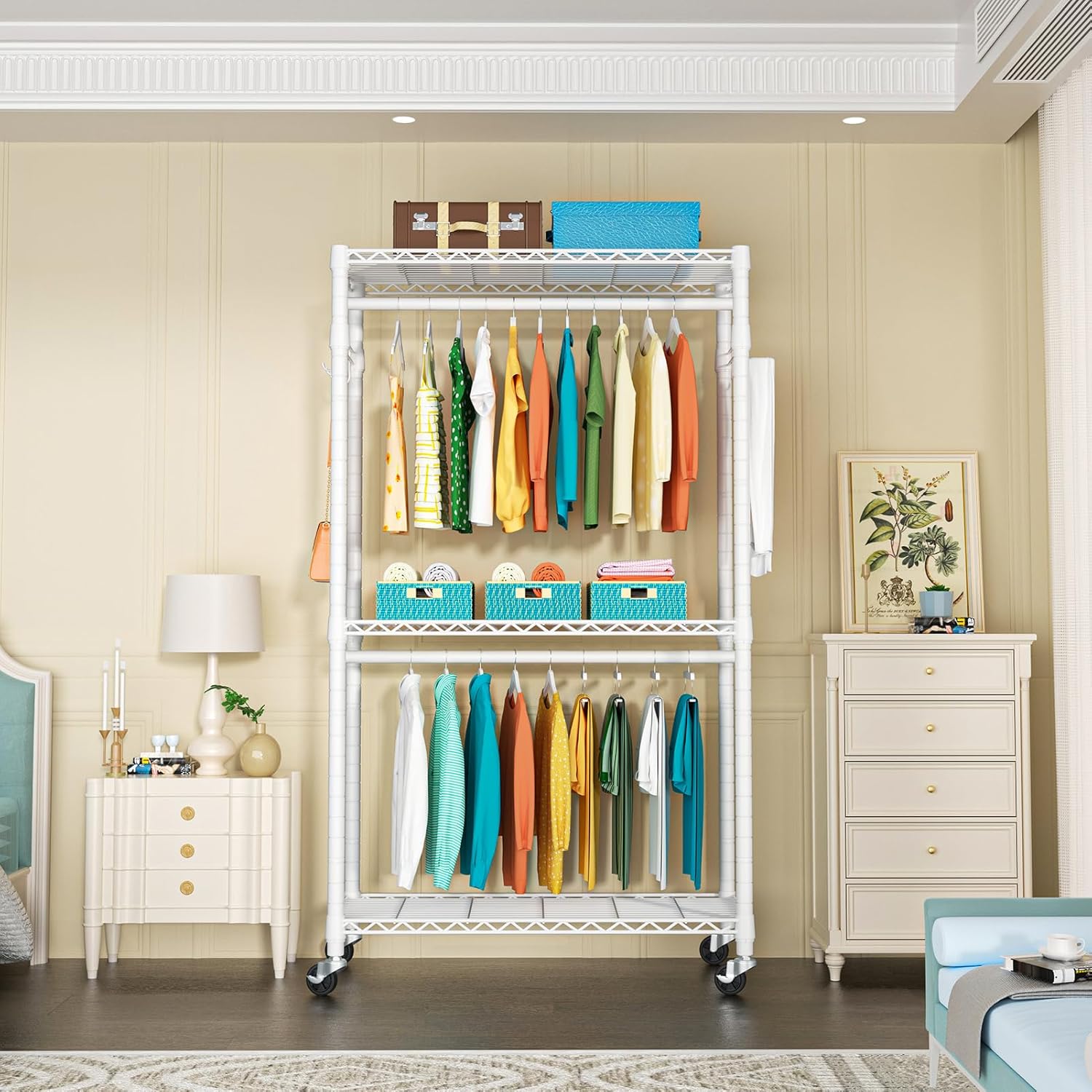 P1 Heavy Duty Garment Rack, 3 Tiers Adjustable Rolling Metal Closet Organizer with Lockable Wheels, FreeStanding Wardrobe with Double Hanger Rods & 1 Pair Hooks, Max Load 450 LBS, White