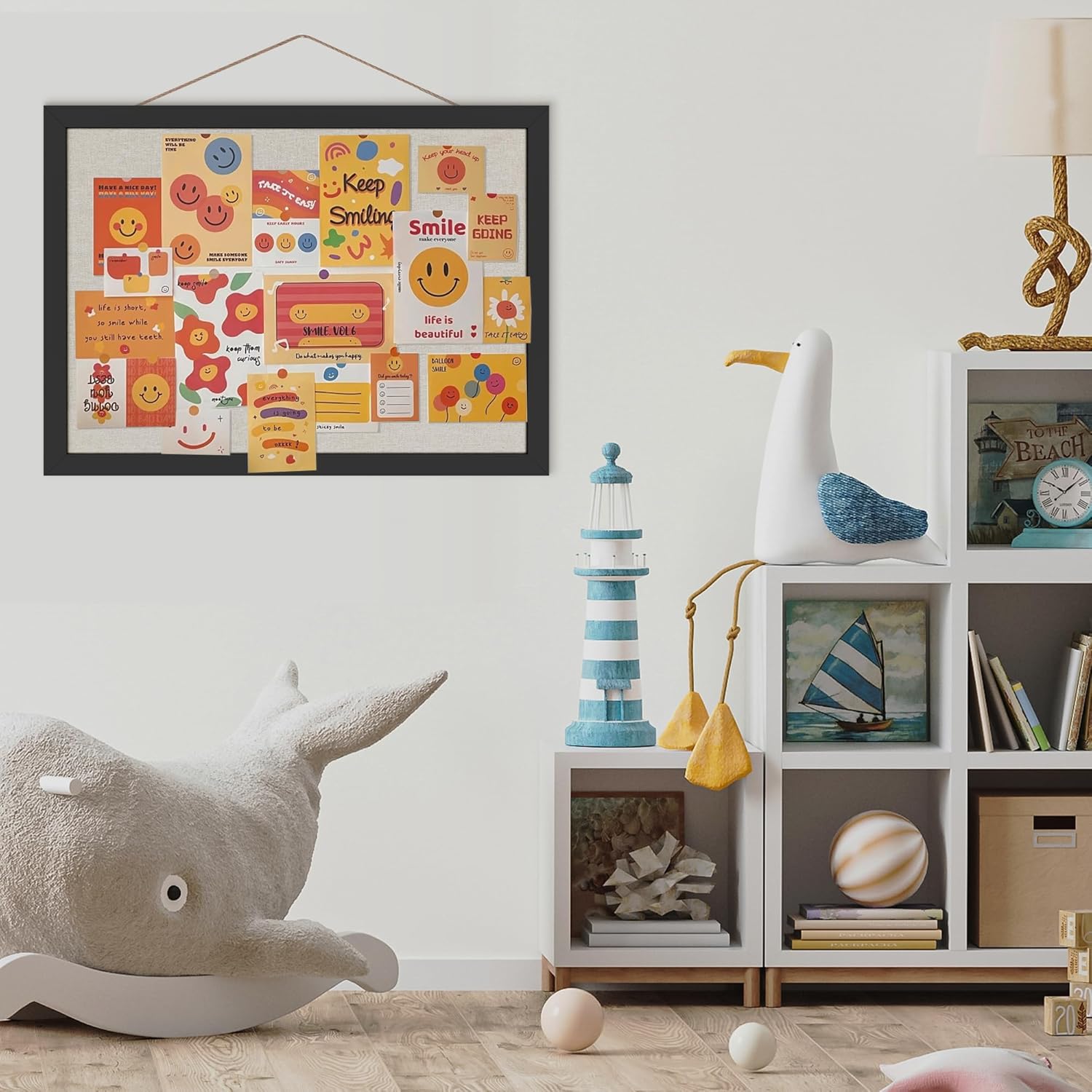 Cork Board Bulletin Board 16.7" x 11", Small Linen Corkboards with Frame for Walls, Cute Picture Display Pin Board Vision Board for Room School Office Bedroom 8 Pushpins Vintage Black