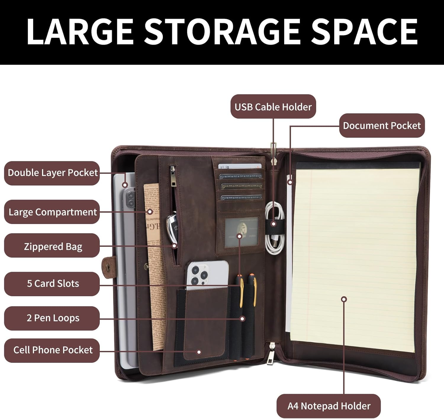 - Ultimate Organization Companion: Spacious compartments for documents. Inside YKK zippered pocket for secure storage. 5 convenient card slots, 2 pen loops for quick access, a dedicated cell phone pocket, and even a USB cable holder. Stay impeccably organized and make a powerful statement in any business setting.
