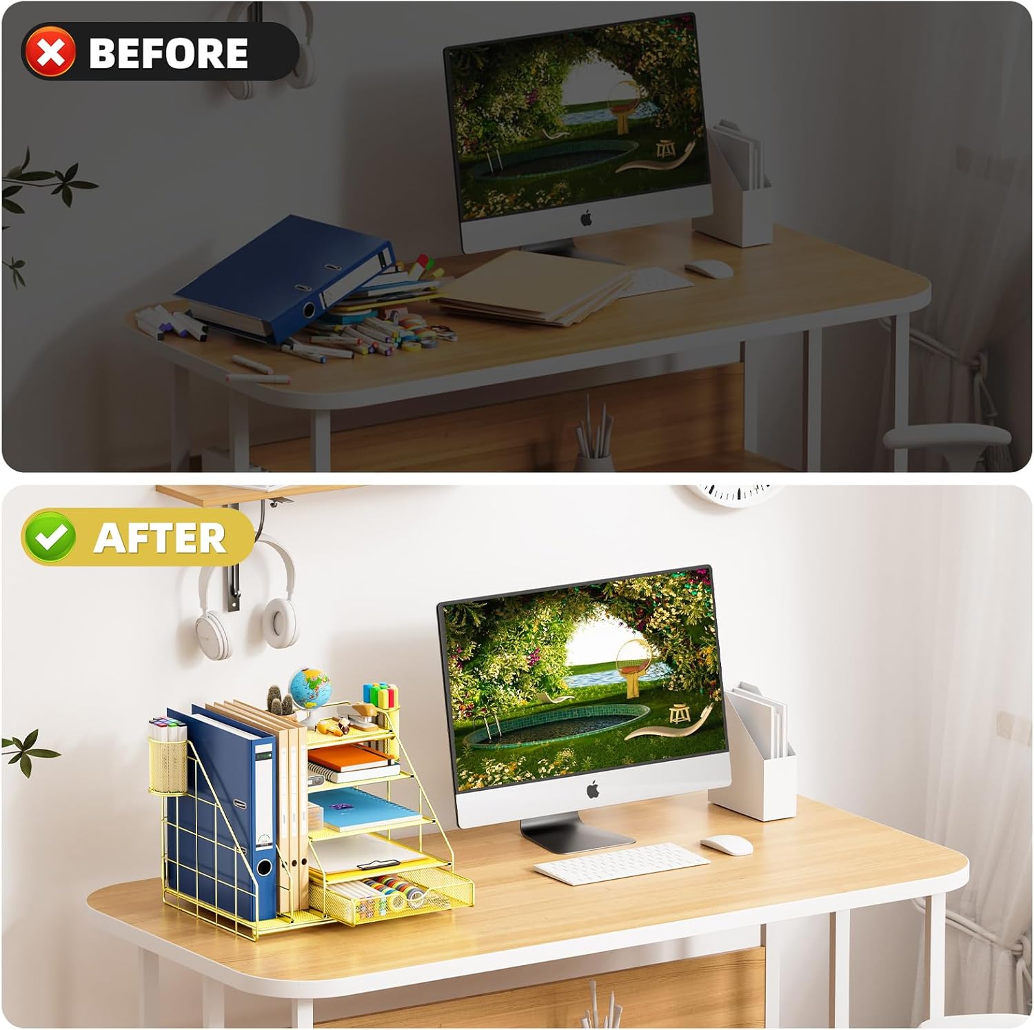 - ăLarge CapacityăThe desk organizer maximizes both the storage area and your desk's available space. For your notebooks, magazines, letters, and A4 paper, the ladder paper tray organizer would provide ample space. If you have documents and folders to store, consider using the vertical file holder to keep your office documents in order. The drawer organizer and hanging pen holder are enough to accommodate all office supply accessories and so on. Perfect Size:14.4*11*12inch