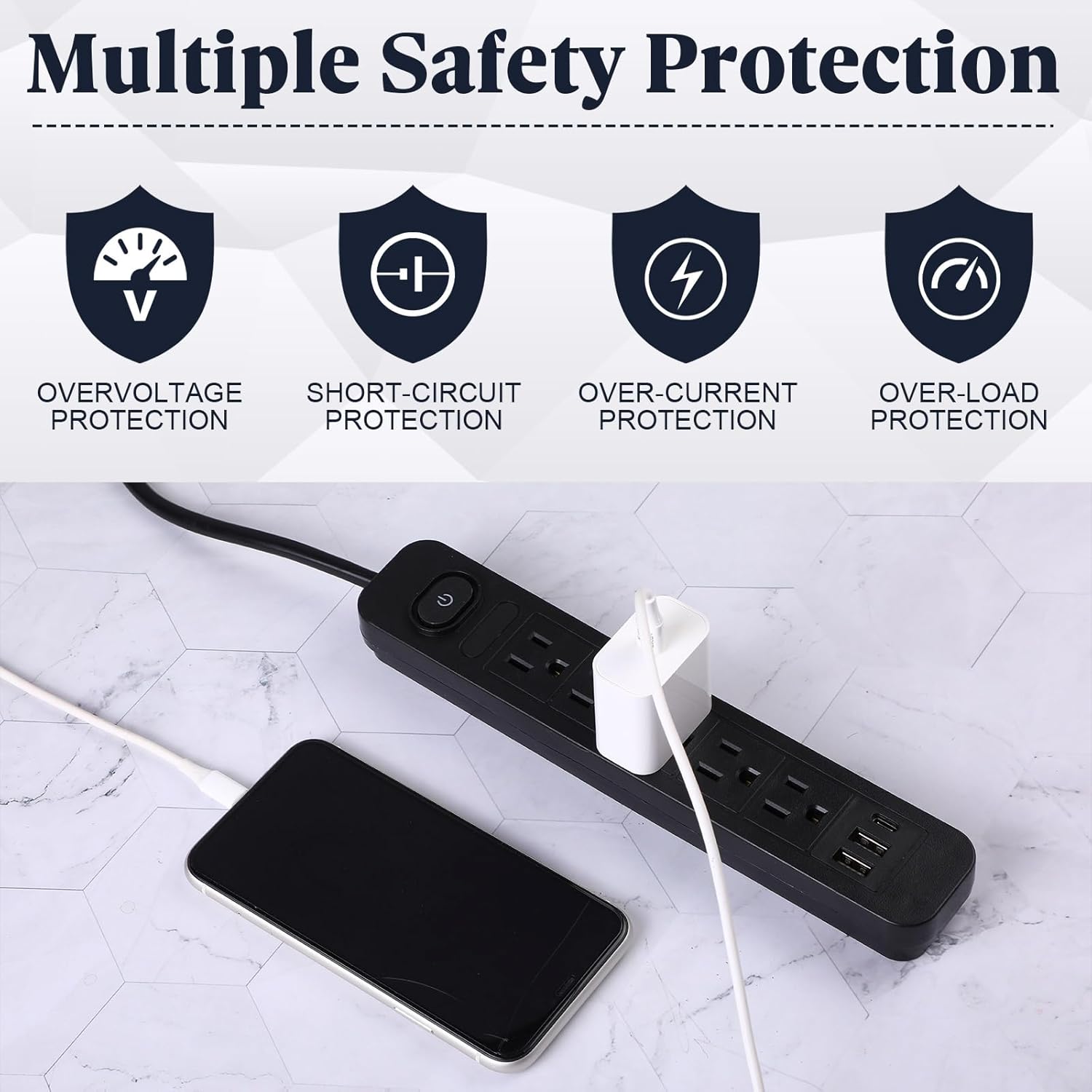 - Multiple Charging Options: you will get 6 pieces of power strips; This power strip offers a wide range of charging options with 5 AC outlets and 3 USB ports which including 2 USB ports and 1 USB-C ports (total: 5V/3.0A, 15W), making it a convenient and versatile choice for your devices; Whether you need to charge your phone, laptop, or other electronics, this power strip has got you covered; They have a full surge protection against voltage fluctuations
