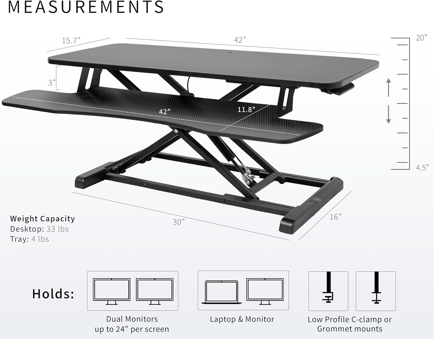 - Carbon Fiber 42" Surface: The top surface measures 42” x 15.7”, which provides plenty of room for dual monitors. The 42” x 11.8” (10.2” in center) keyboard tray raises in sync with the top surface to create a comfortable workstation