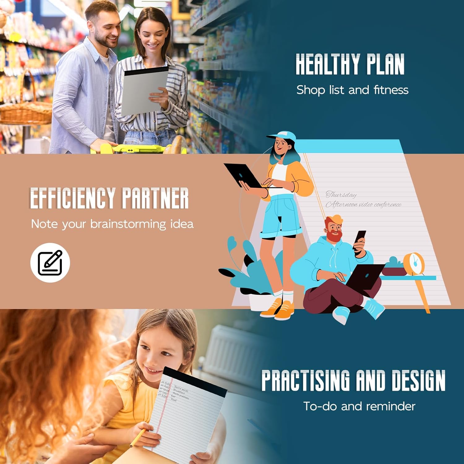 - 【Double-Sided Printing】The 8.5" x 11" writing pad is designed with double-sided printing, providing you with twice the writing space without wasting any paper. Each pad contains 30 sheets with 60 pages, Valuable note pad paper gives you plenty of space to record your ideas/ to-do. Make the most of these legal pads to note brainstorming idea/ homework practicing/ shopping list, etc.