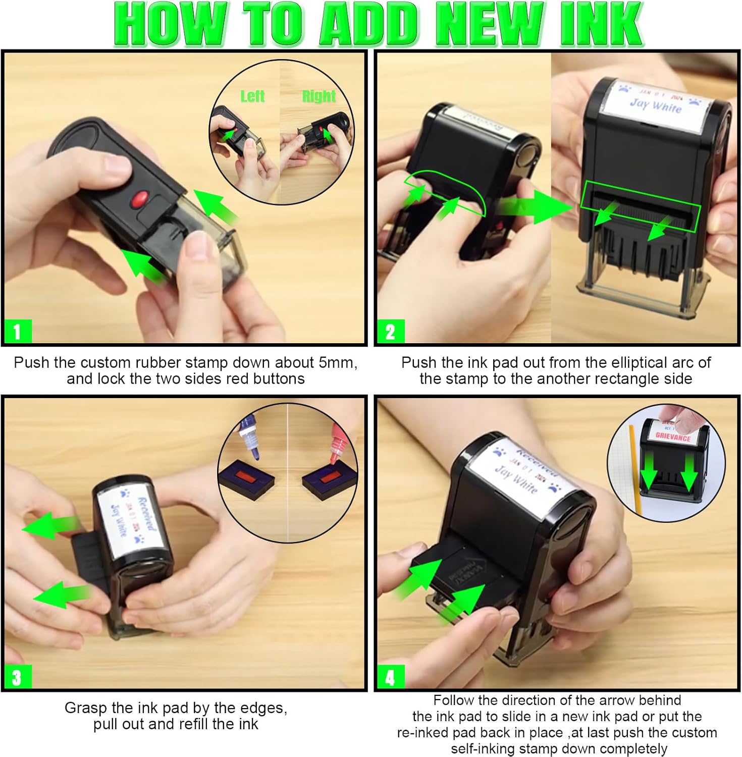 - Re-inkable Custom Date Stamps:High quality pre-inked date stamp could mark thousands of smooth impressions before ink dry.When the impressions begins to fade,the ink pads could replaceable or refill.Durable ABS heavy duty frame for long lasting durability