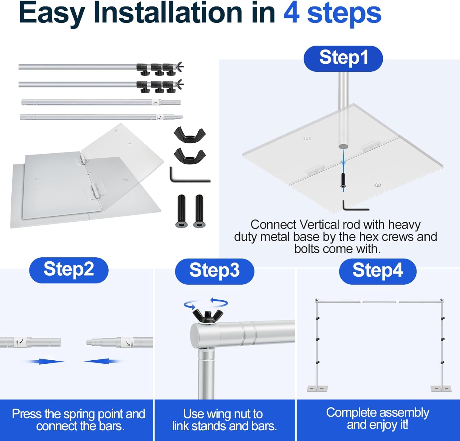- 【Convenient Assembly】 The metal background support stand is easy to install and can be quickly assembled in a few minutes. Before installing, refer to the instruction manual or installation video on the product page to learn how to complete the installation correctly and quickly