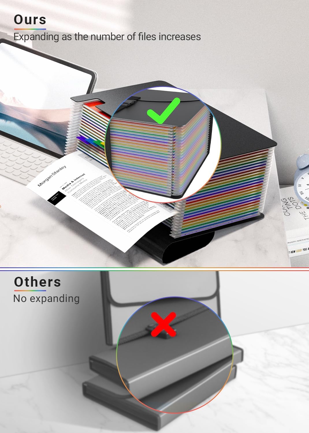 - ✔【ADVANTAGE】The lid of file folder organizer is designed with an extension line. The interior of file folders can be fully expanded and adjusted to the perfect position at will as more and more files are put in. It's definitely a useful and fashionable expanding file folders.