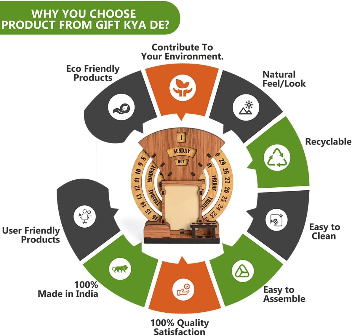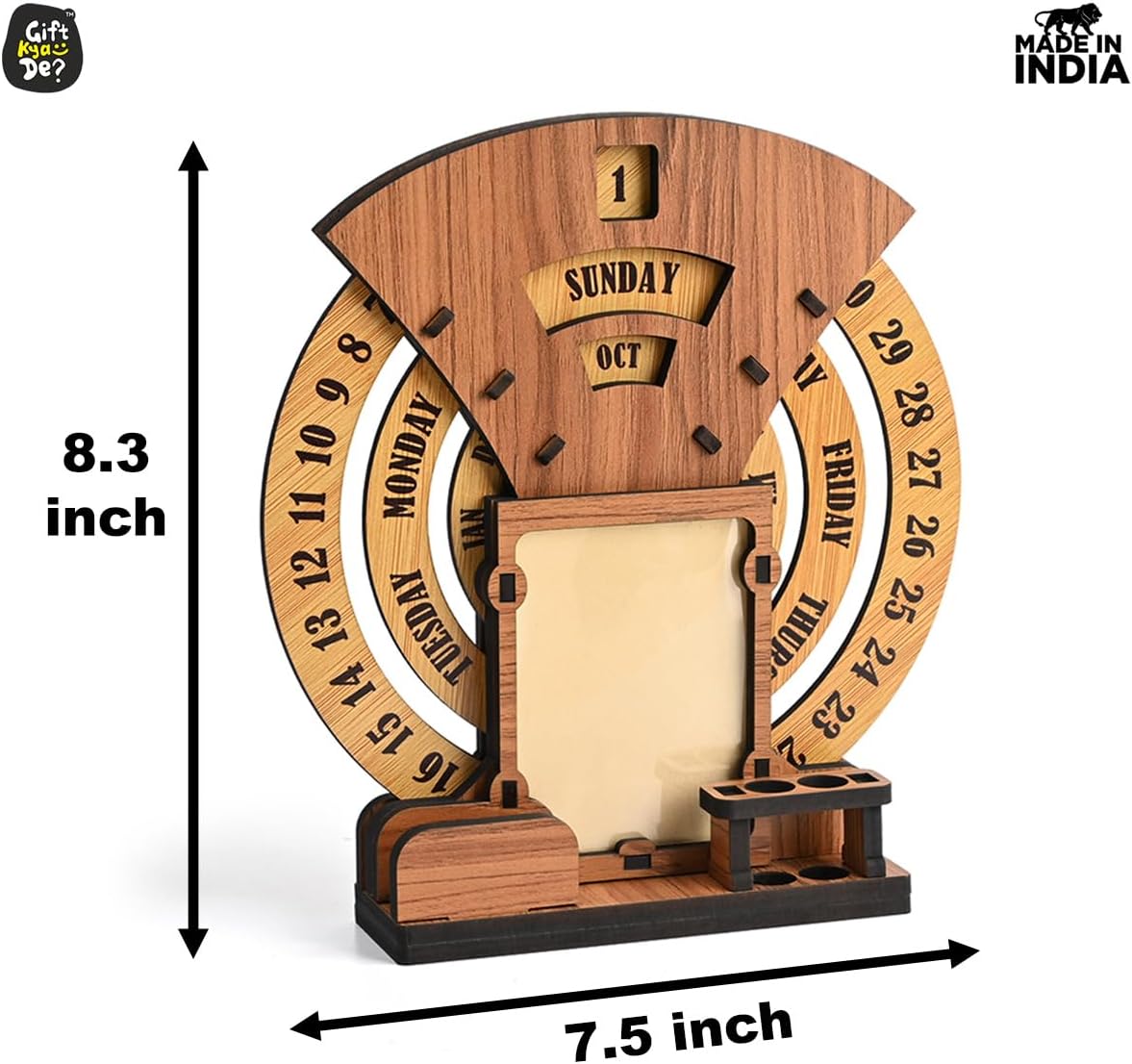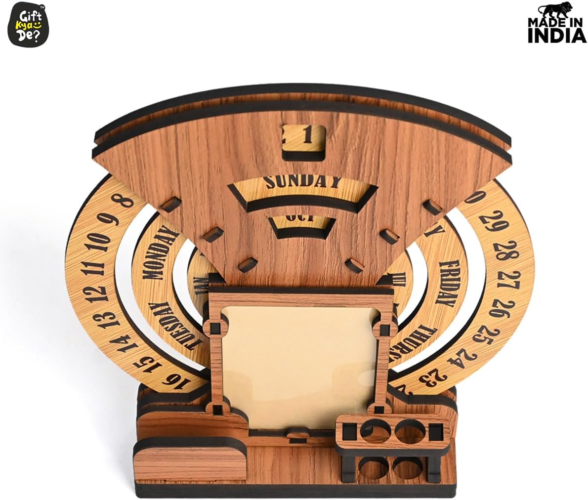 - Designer Home Decor: The beautiful designer calendar 2025 , where you can keep your photo, pen, and cardholder that serve as the perfect piece of home and office decor. Three individual circular rings dedicated to dates, days, and months are placed in an indigenous manner, which may be rotated very easily and precisely to change days, dates, and months to give you a new day every day. This calendar for desks is not limited to any particular year.