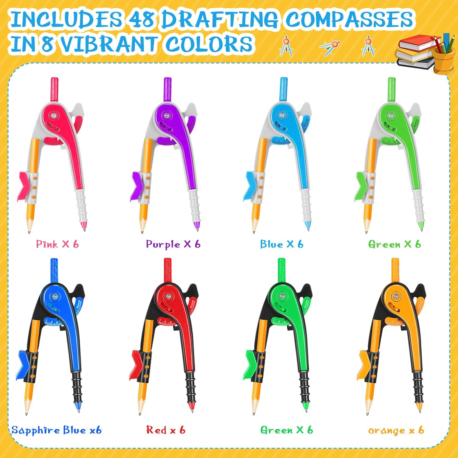 - Pack Includes: package includes 48 drafting compasses in 8 vibrant colors; Each compass comes with a detachable pencil; Ideal for school districts and teachers in need of multiple compasses for students