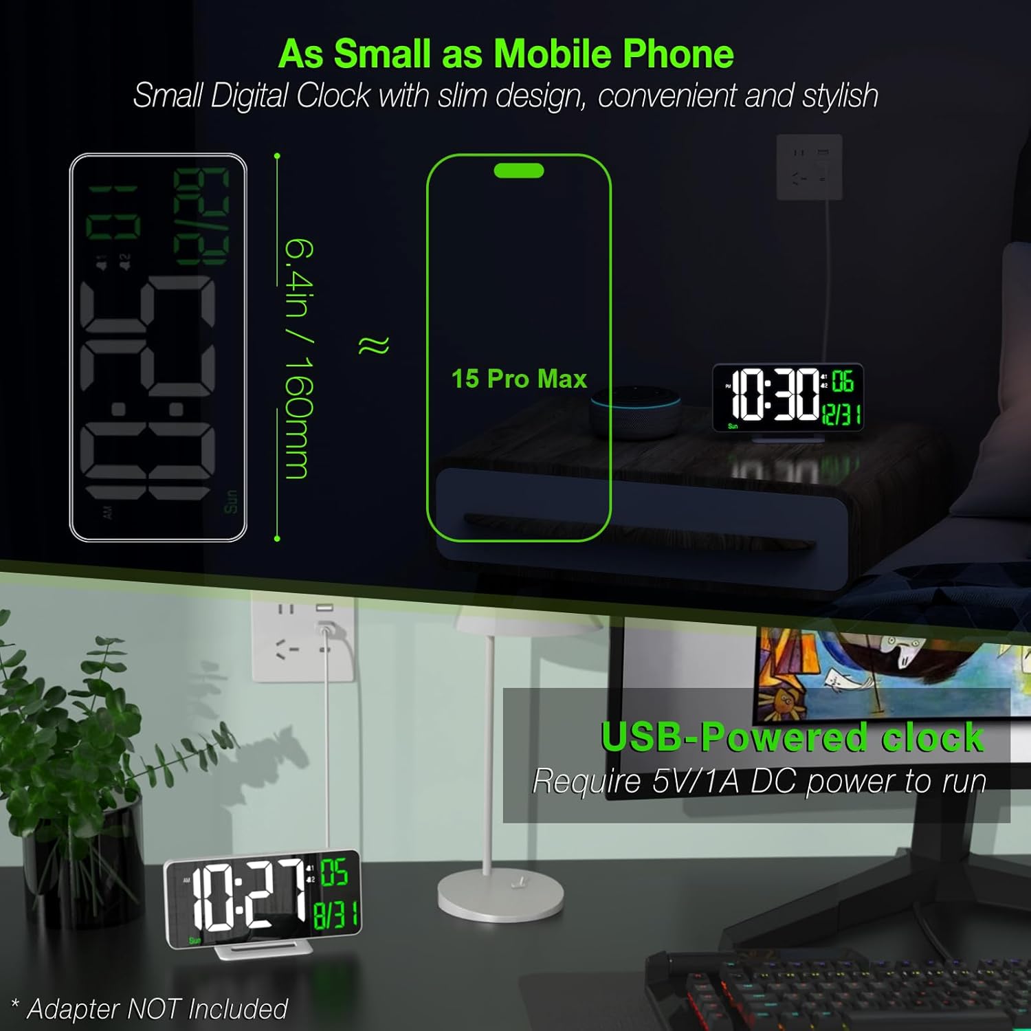 KOSUMOSU Alarm Clock for Bedroom, 6.7" Led Desk Digital Clock,Mirror Clock,Dual Alarm Clock for Living Room with Seconds,Date,Week,12/24h,Dimming,Temp