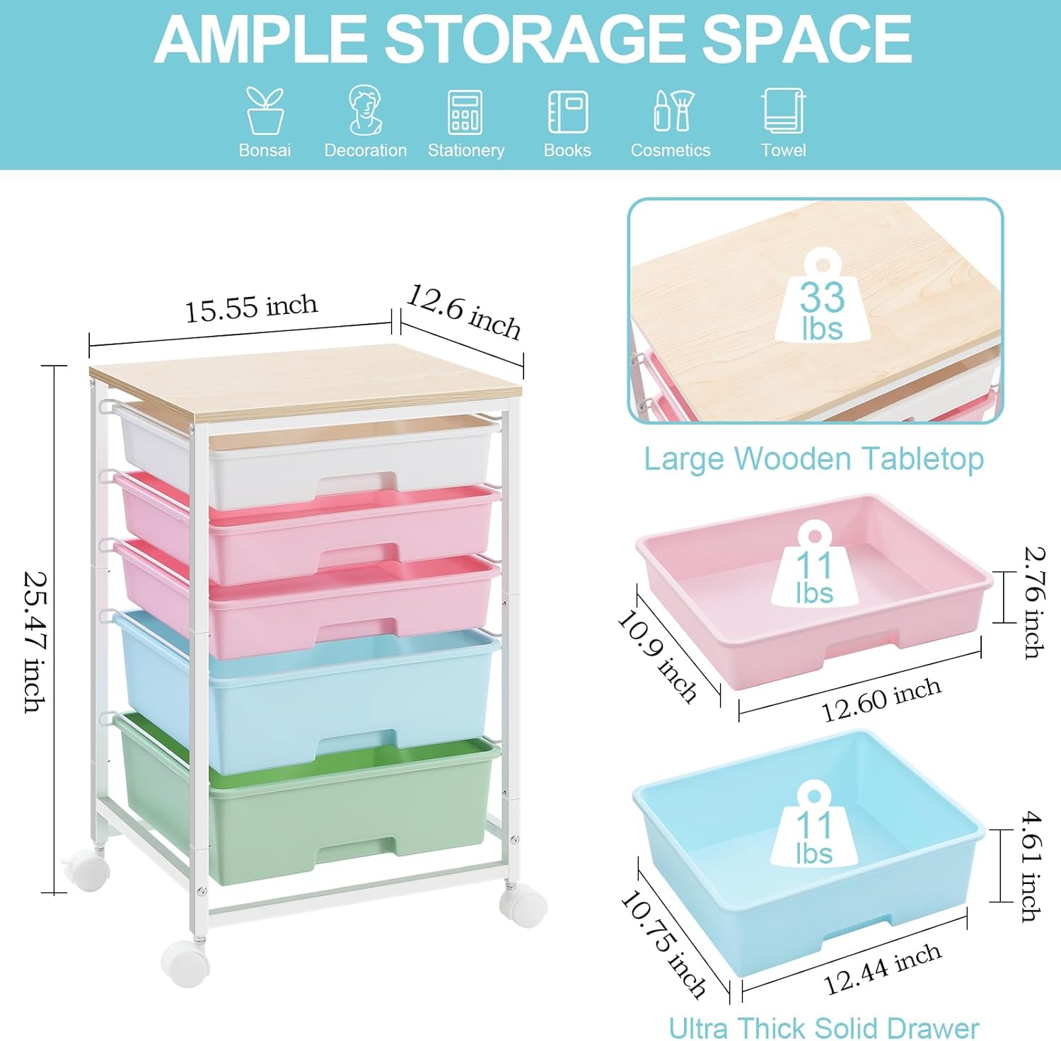 Utility Cart with 5 Drawers,Storage Drawer Cart with Wooden Tabletop and Lockable Wheels,Craft Storage Trolley Cart,5-Tier Rolling Utility Cart on Wheels,Rainbow