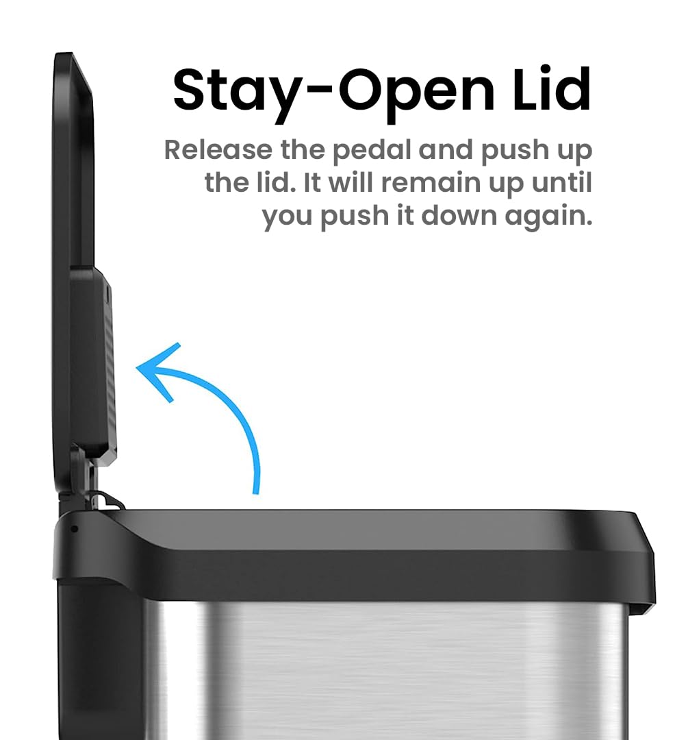- GENTLE & SILENT LID CLOSE – Durable, ergonomic pedal requires minimal force to open; easy to replace air damper for years of like-new performance of our trashcans for kitchens. Our garbage cans are both easy to use and durable.