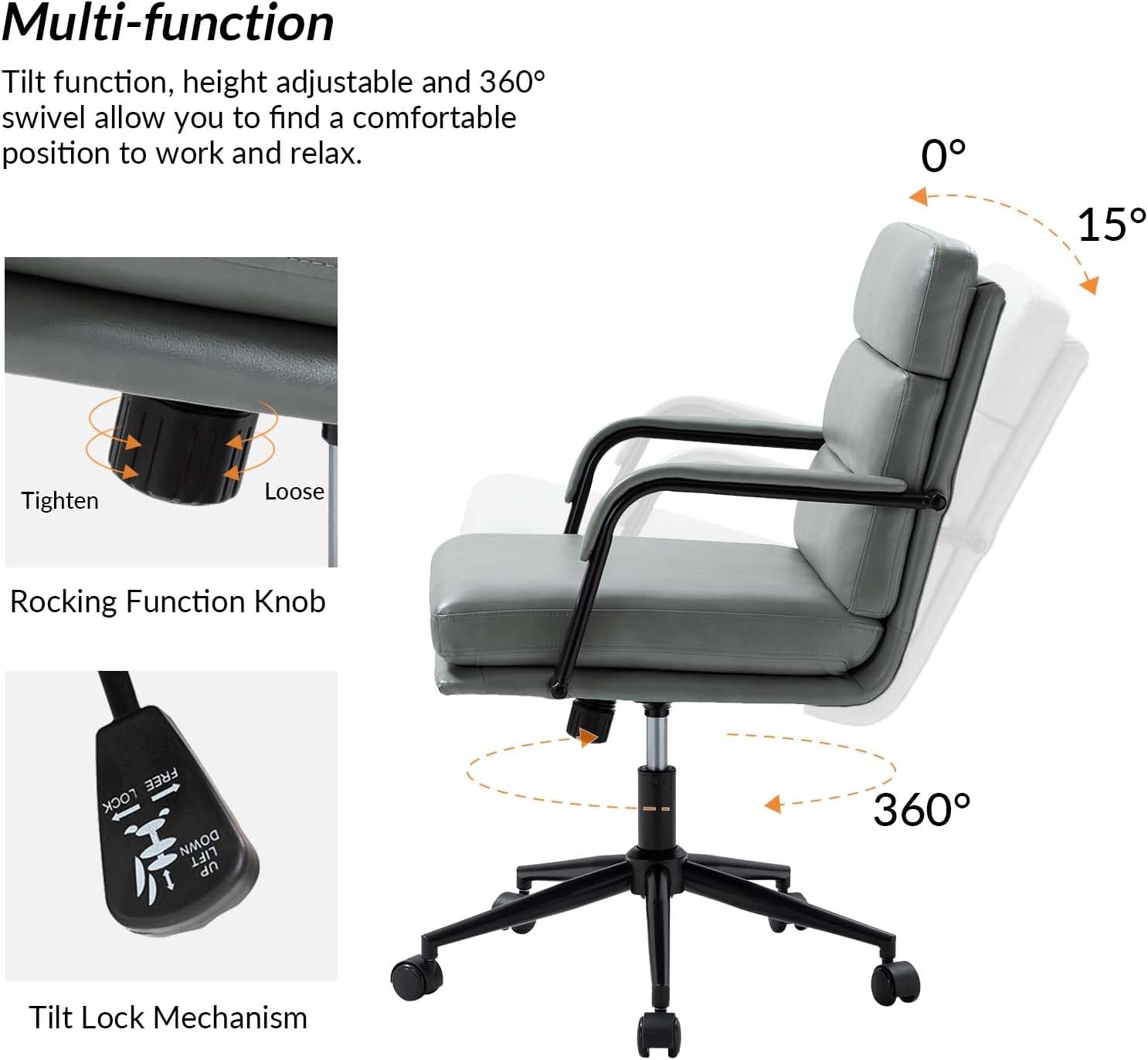 - Tilt Lock and Center Tilt- With its tilt function, the chair offers the flexibility to lean back for a relaxed and comfortable experience, enhancing your workday or meetings with a leisurely touch.