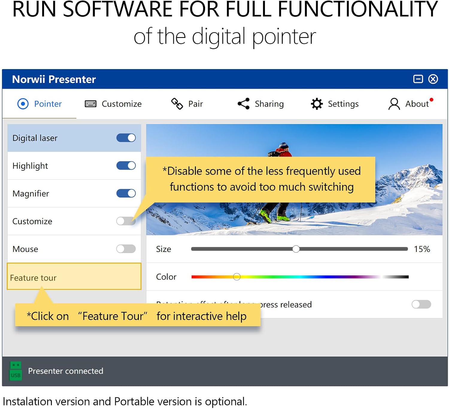 - Highlight and magnify - An advanced digital pointer system can highlight or magnify areas of focus in pixel-perfect detail. These functions are enabled via Norwii Presenter app