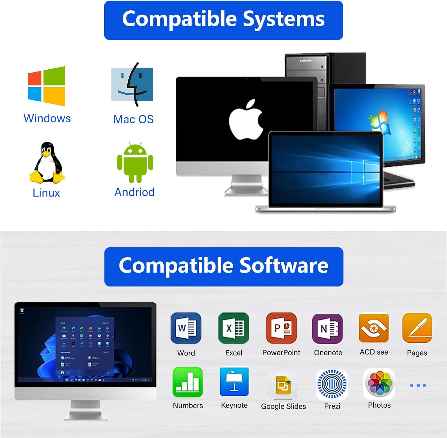- Compatible Devices : Mac OS, Macbook, Chromebook, Windows, Linux, Android, HP, Lenovo, Surface Microsoft, PC, Desktop, Computer, Laptop, Projector Screen, MS Word, Excel, PowerPoint, Google Slides, Prezi, IWORK, Keynote, etc. Mac OS, Macbook, Chromebook, Windows, Linux, Android, HP, Lenovo, Surface Microsoft, PC, Desktop, Computer, Laptop, Projector Screen, MS Word, Excel, PowerPoint, Google Slides, Prezi, IWORK, Keynote, etc.