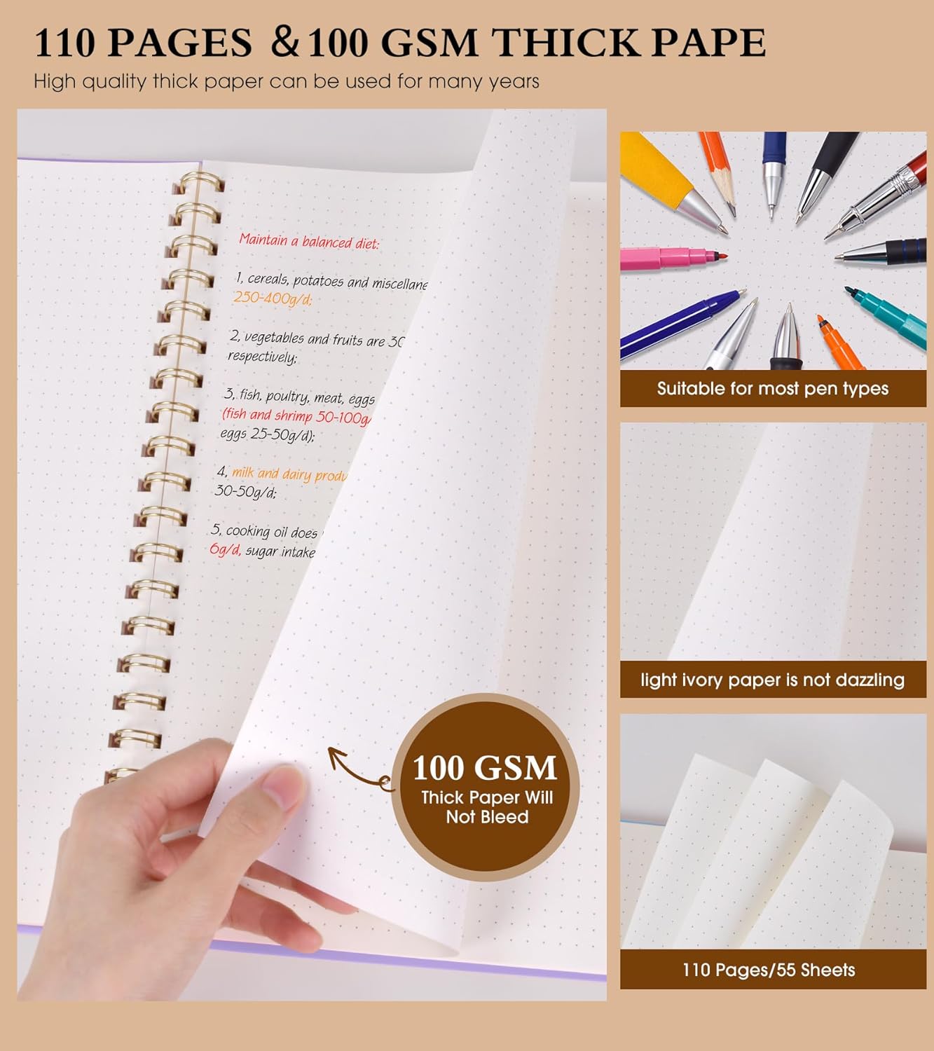 - 【100 GSM Ink-friendly Paper】 Our purple spiral dot grid notebook pages are very thick, which avoids ink bleeding through and ghosting. Suitable for most pen types, such as ballpoint pens, fountain pens. Each dotted journal 55 sheets/110 pages, offering enough space to write in. Allowing you to write on both sides of every page to maximize your usable space. light ivory paper is not dazzling, let you have a comfortable writing experience.