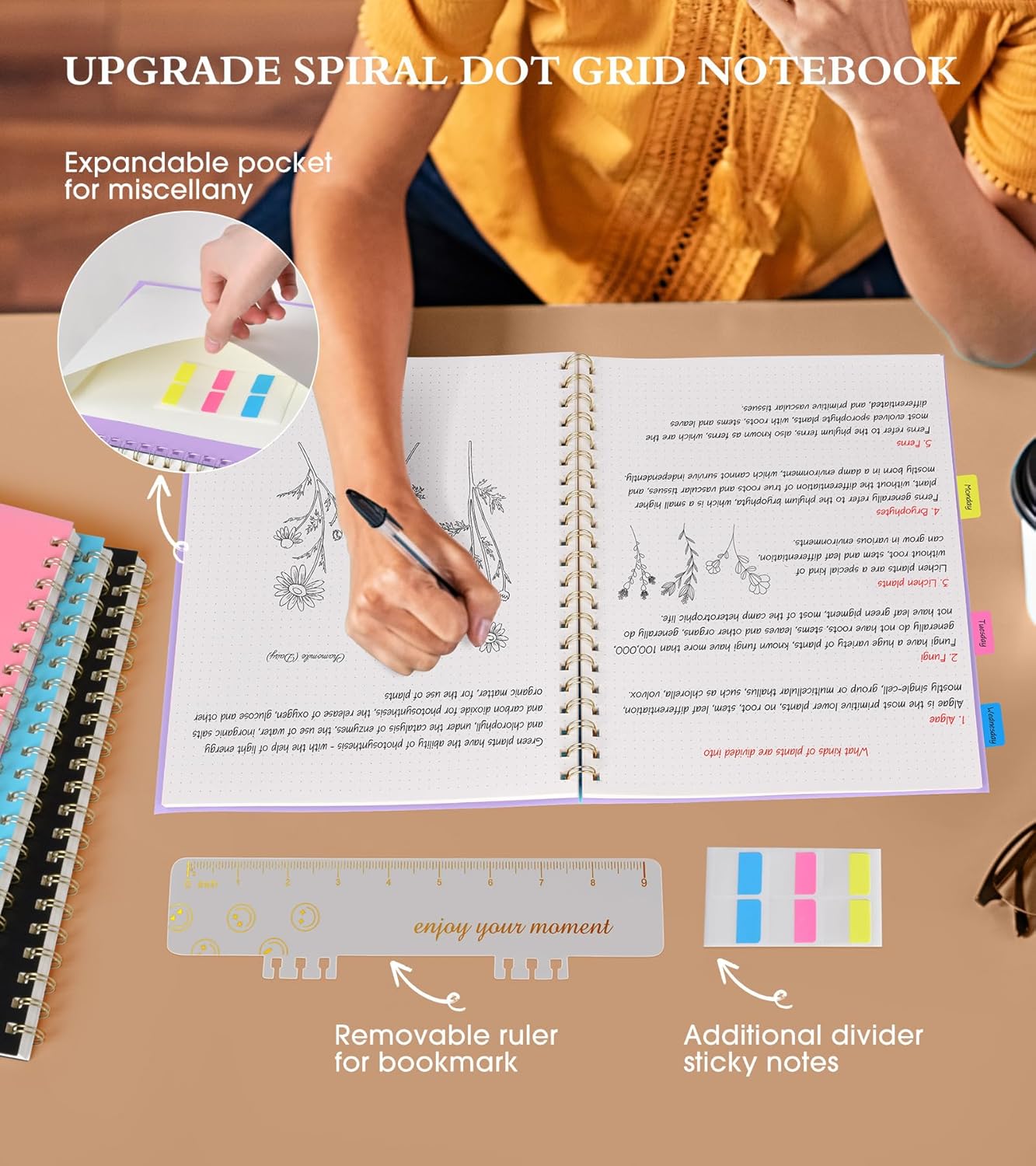- 【Upgrade Dotted Journal Notebook 】The bullet dotted journal has many upgrade features. Come with an elastic closure band, works as bookmarks. Equipped with a removable ruler can help you measure and chart. Personal information page makes it easy to keep track of queries. The back cover includes an expandable pocket for cards and note-taking notes. 1 gift of multicolor index tabs stickers for classification and reference.
