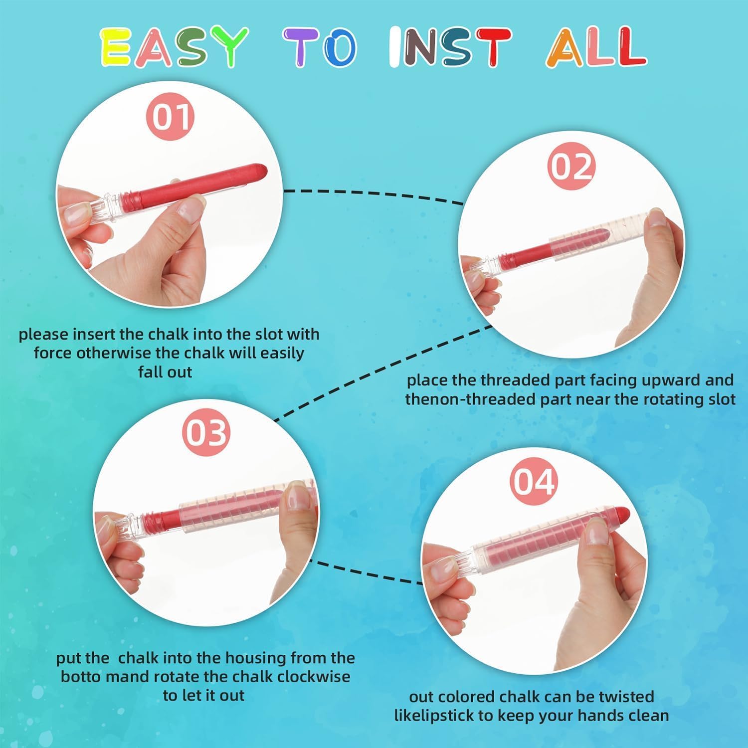 - Pros: Our dustless chalk is adjustable chalk holder, can be rotated like lipstick, easy to use, protects chalk from breakage or damage, and avoids chalk dust flying into your eyes.