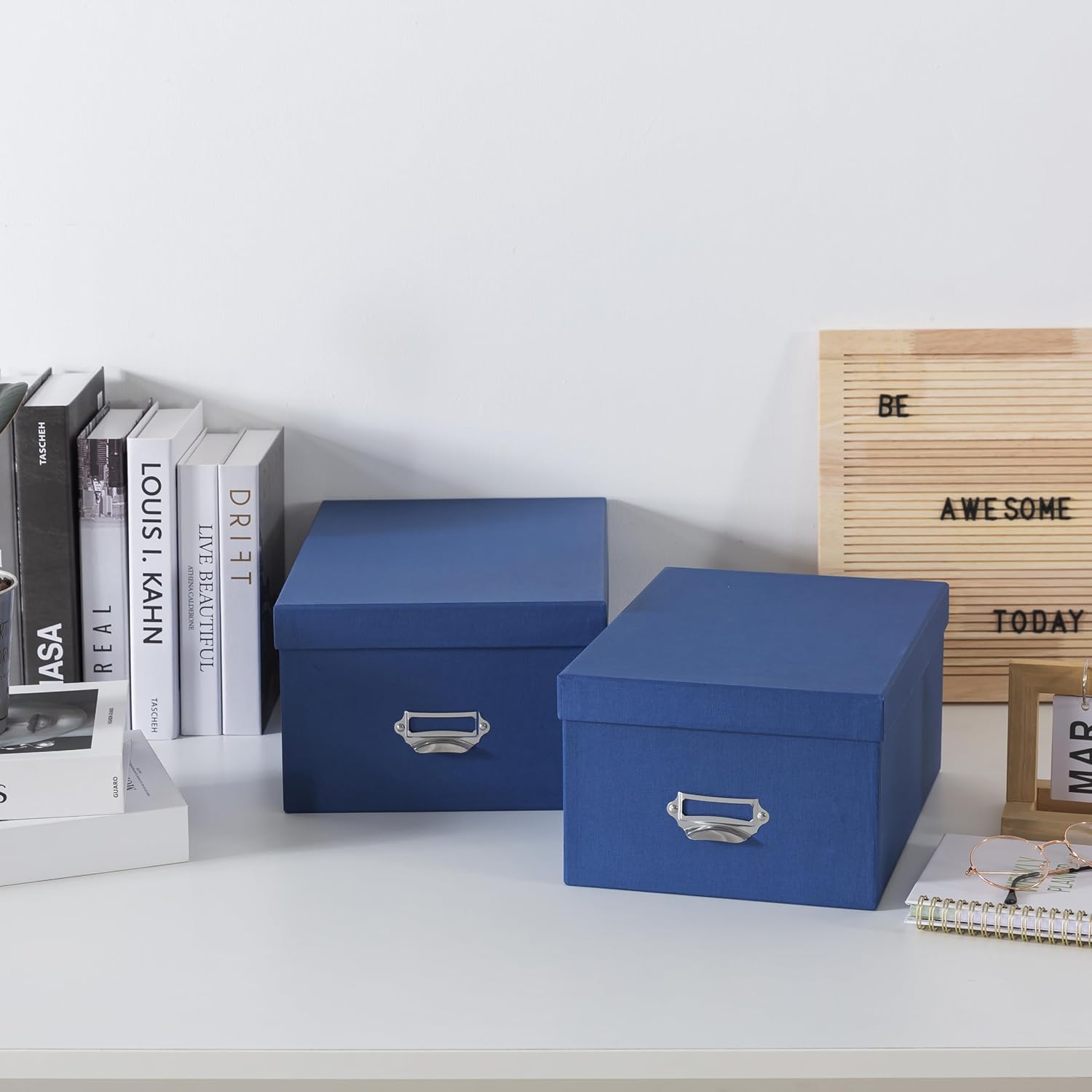 - SLEEK MODERN AESTHETIC: Elevate your home or office decor with these elegant blue cardboard storage boxes. Featuring a sophisticated linen-like texture and silver hardware, they blend seamlessly with contemporary interiors while providing functional storage. The matte blue finish adds a touch of understated luxury to any space.