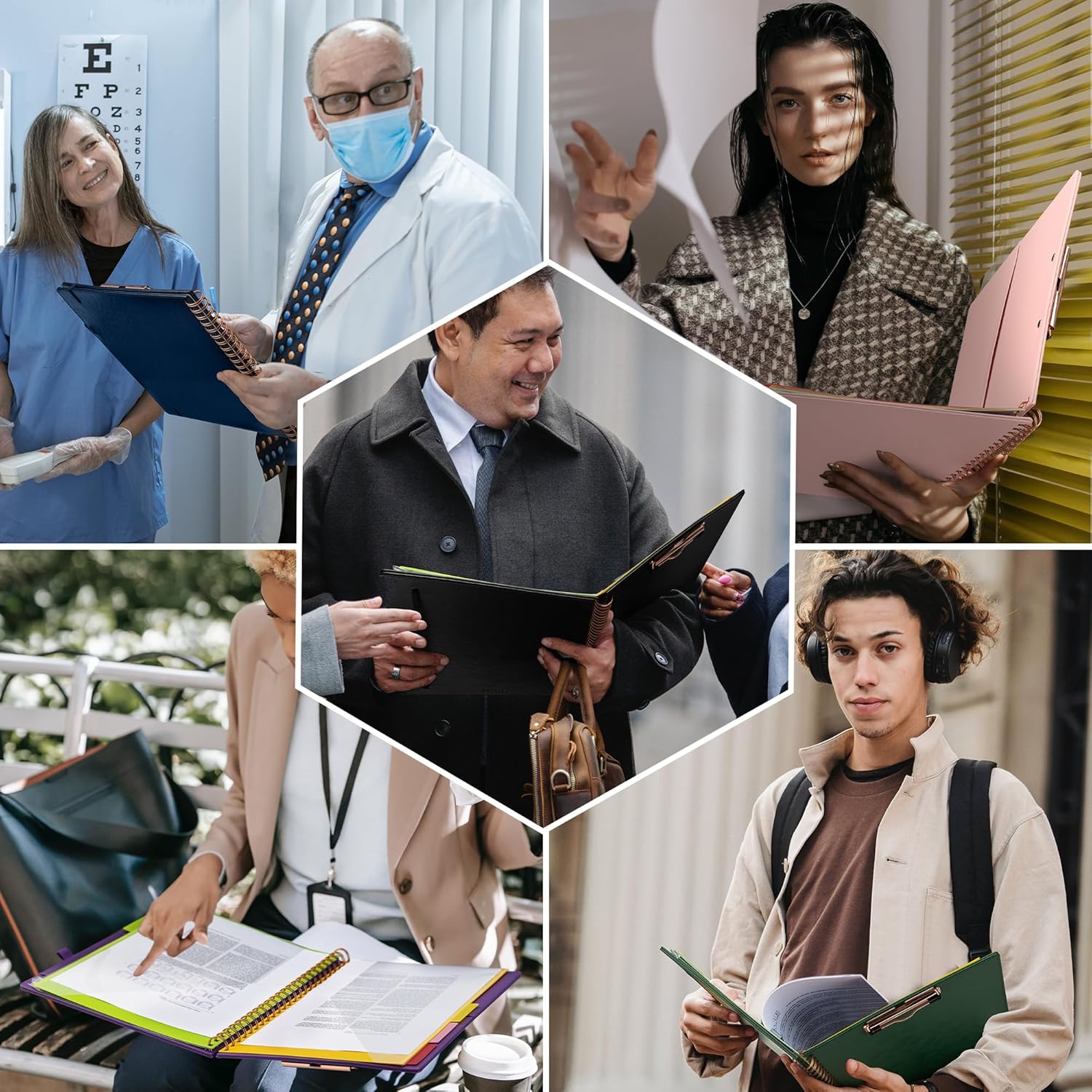 - 【Powerful Functions】Low-profile clip arc design make it easy gripping and extraction paper, holds up to 80-100 sheets paper. Clip board has a Hidden retractable hanging hole on the top, Easy to hang. Pen Loop for quick, easy storage. Double-loop Metal Spiral have the ability to flip the cover to the backside and use it like a clipboard, no creases and cracks to offer durability. Elastic closure, The elastic band keeps the portfolio closed and prevents contents from getting damaged.