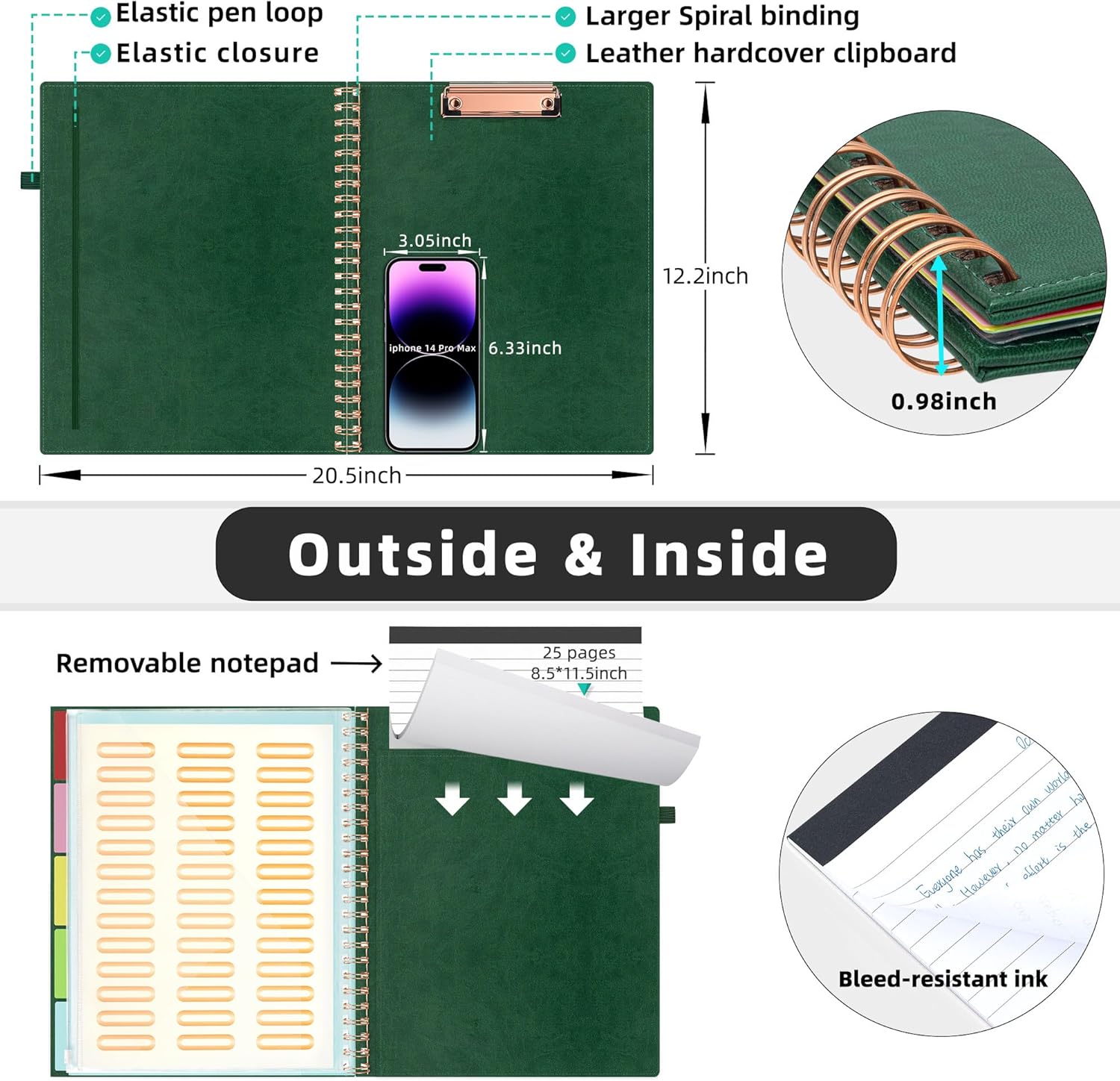 Ospelelf Leather Clipboard Folio with Notepad for Letter Size, Spiral Clipboard Folder with Storage Zipper Pouch, 5 Folders with 10 Pockets, 39 Divider Label Stickers, Pen Loop Series (Green)
