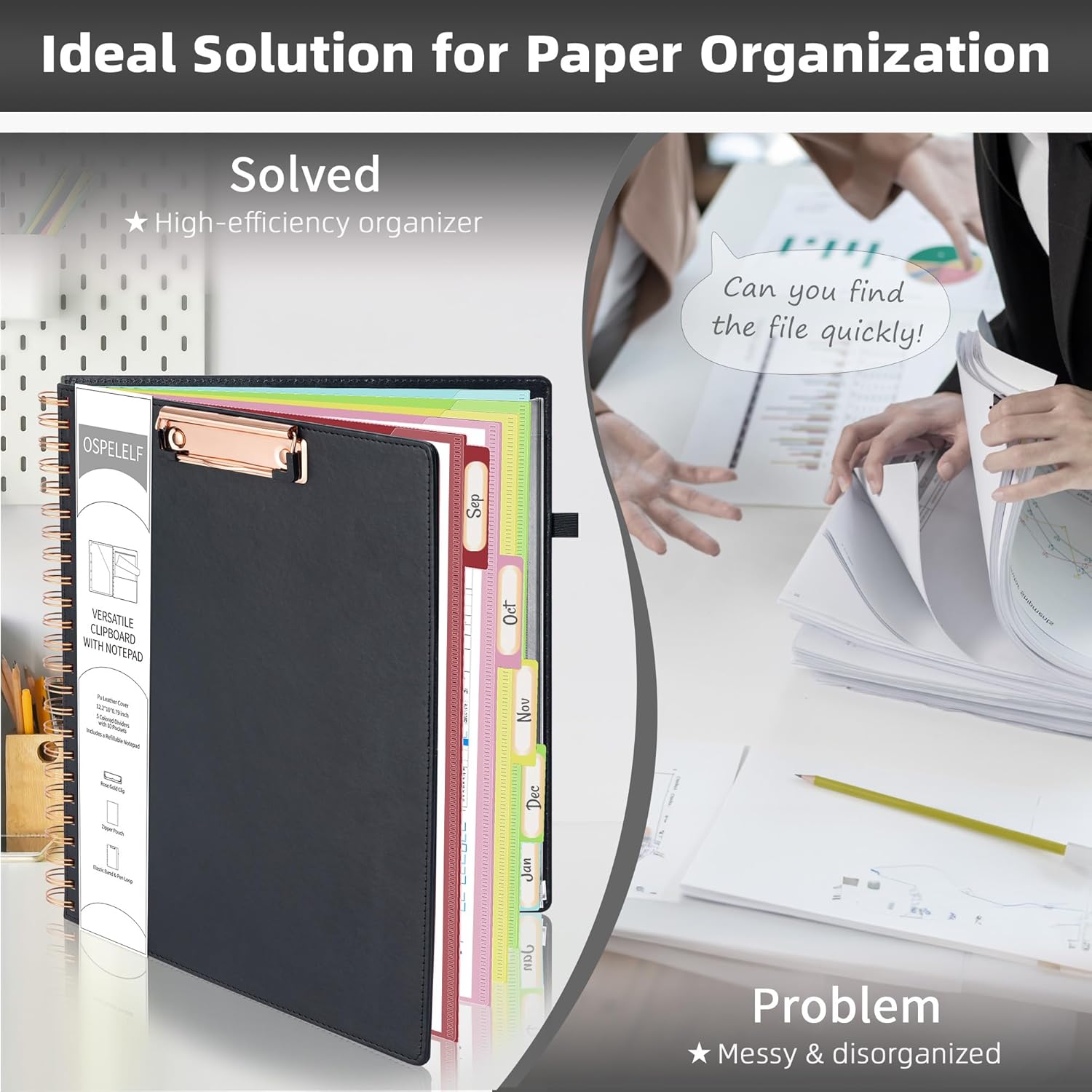 Ospelelf Leather Clipboard Folio with Notepad for Letter Size, Spiral Clipboard Folder with Storage Zipper Pouch, 5 Folders with 10 Pockets, 39 Divider Label Stickers, Pen Loop Series (Black)