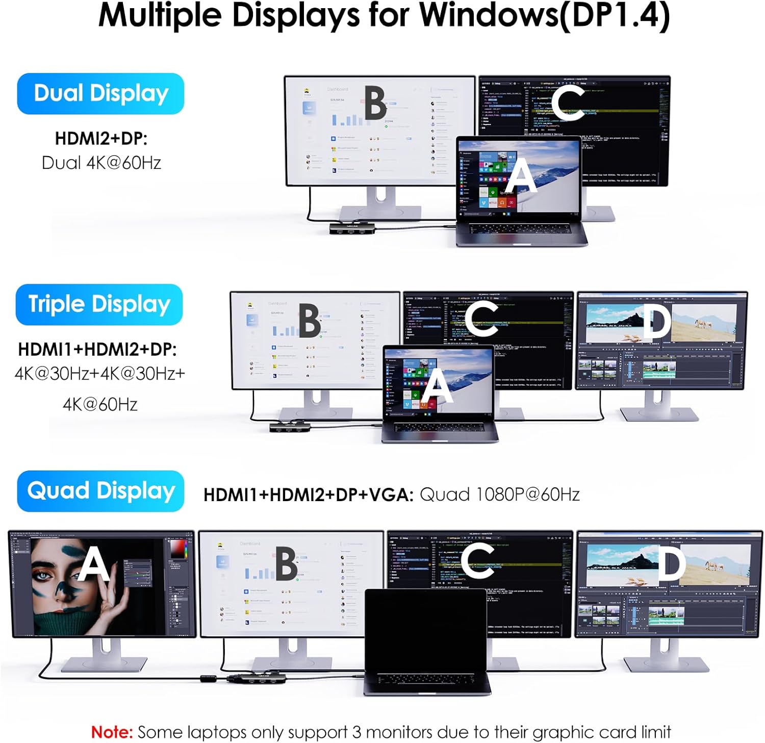 - USB C dock 4K Display Adapter: Your laptop specification under DP1.4 source, Dual HDMI and DP ports supports up to 4K dual/triple video output (4K@30Hz+4K@30Hz+4K@60Hz). For quadruple display Dual HDMI, DP, and VGA all are 1080@60Hz. NOTE: Some Windows laptops only support 3 monitors (including the host screen) due to their graphic card limitations
