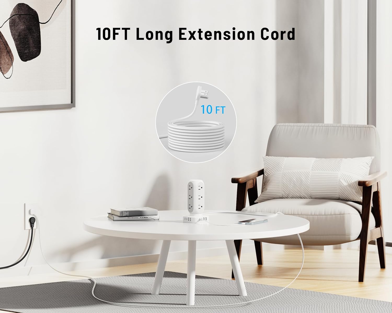 Flat Plug Power Strip Tower 10FT, 40W Total Fast Charging Station, Dual PD 20W USB-C Surge Protector with 12 AC Outlets and 8 USB Ports (4 USB C), Long Extension Cord for Home Office Dorm Room
