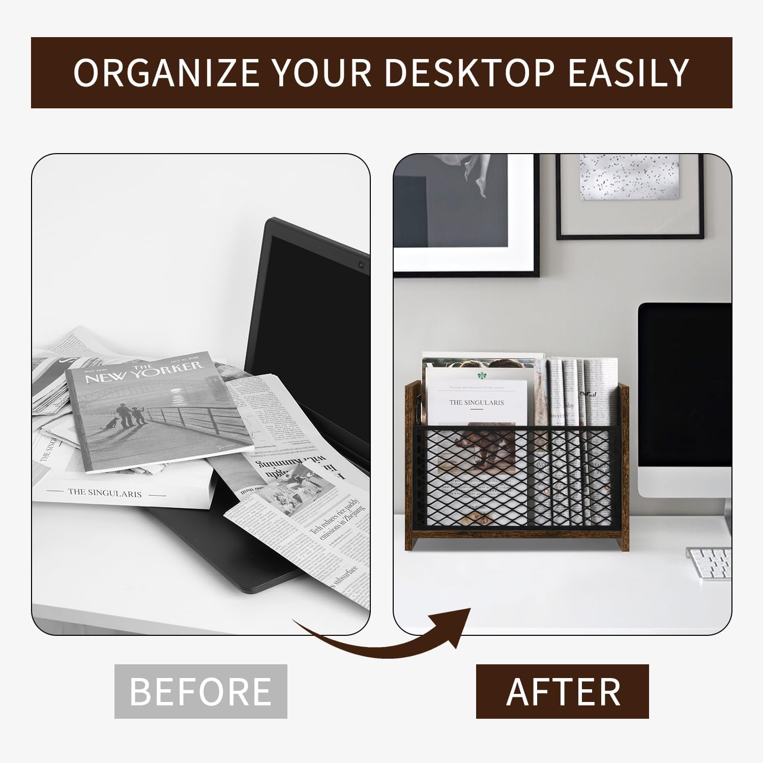 - Space Saving: Our magazine file holder sizes are about 14.09"L×7.48"W×10.43"H. Perfect size for a relatively small living room area. Rustic magazine rack helps reduce magazine clutter and keeps them all in one place. It looks great in your living room and keeps your floor or desktop organized.